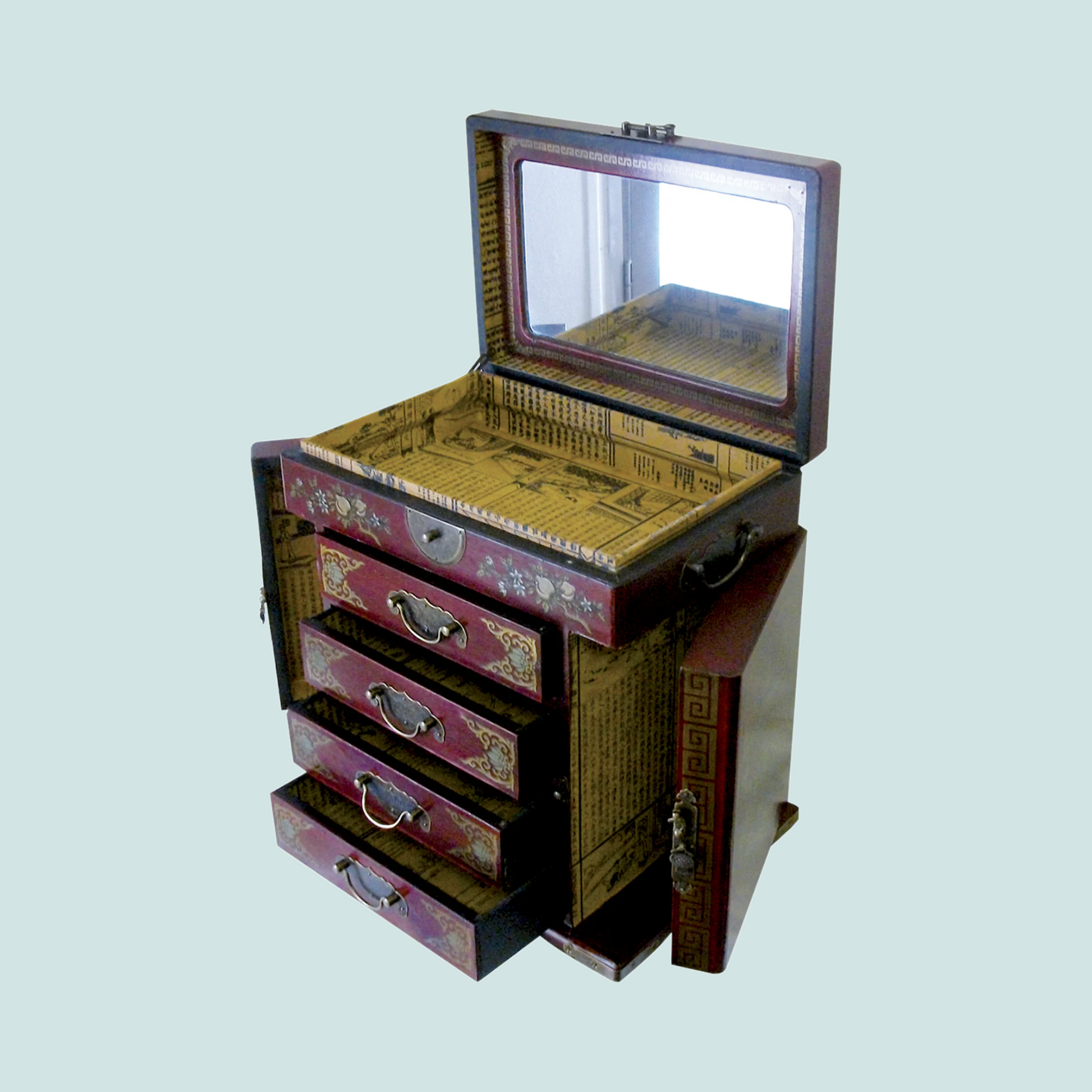 Superbe petite pièce de mobilier pour ranger tous vos bijoux, et prendre le temps de vous regarder dans un miroir dissimulé à l’intérieur du casier supérieur ! Structure bois massif de bouleau, médium. Fabrication artisanale avec décor peint à la main sur cuir tendu sur bois. 4 tiroirs. H. 34 cm, 32 x 23 cm