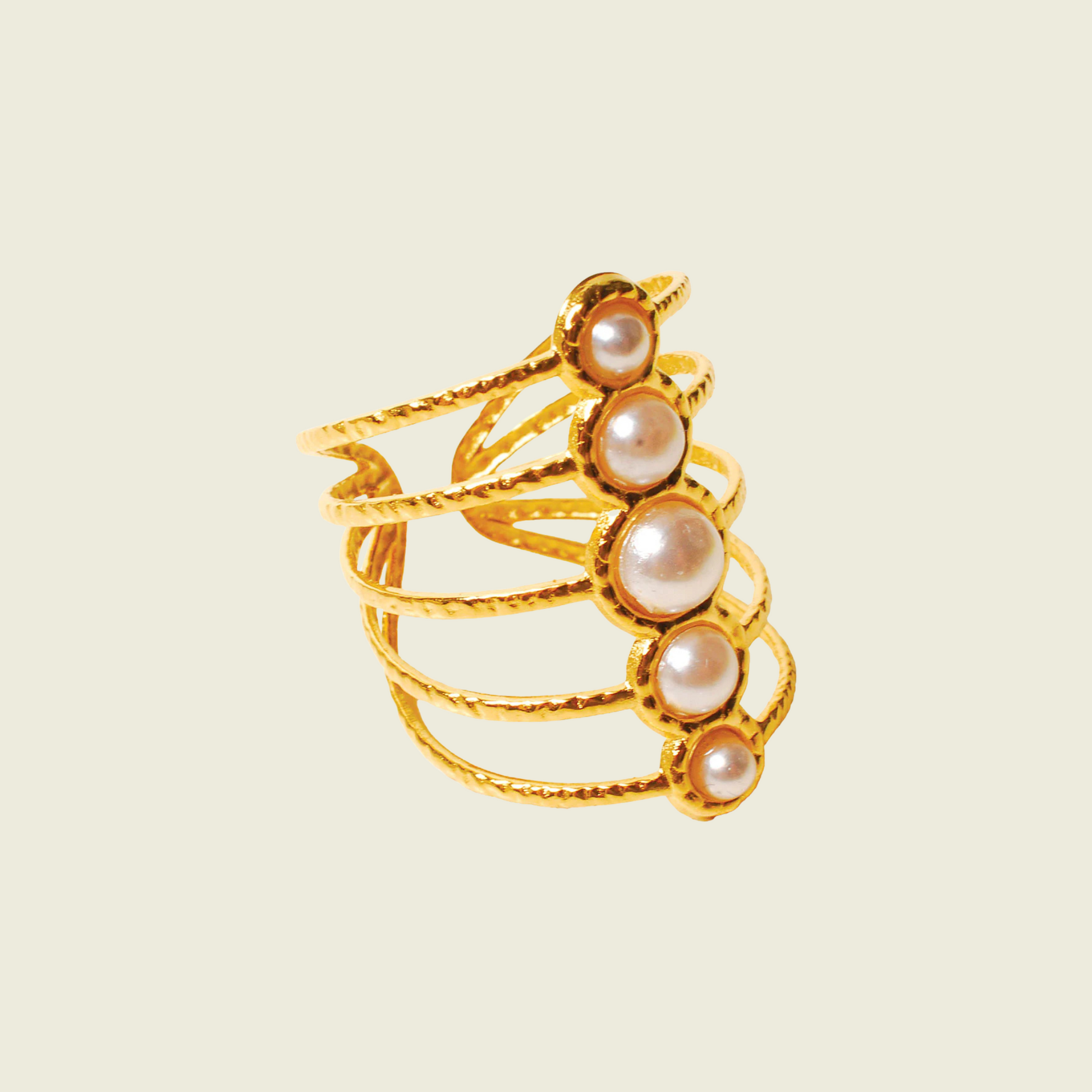 Ces 5 perles, mises en valeur par cet assemblage raffiné de fils d’or, symbolisent les 5 amours d’Aphrodite : Arès, Adonis, Anchise, Hermès et Dionysos. Une bague très originale et pleine de sens. Création exclusive – Acier inoxydable doré or fin - Perles de nacre - Réglable. L. 2,6 cm