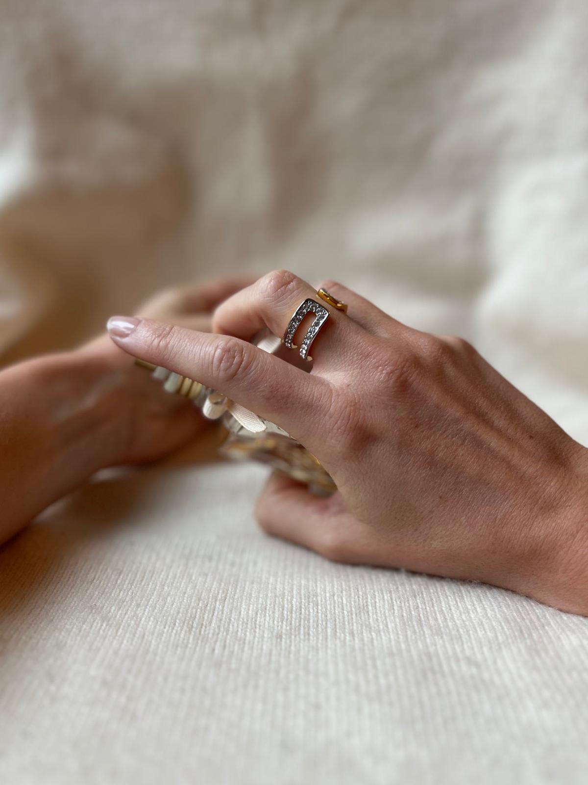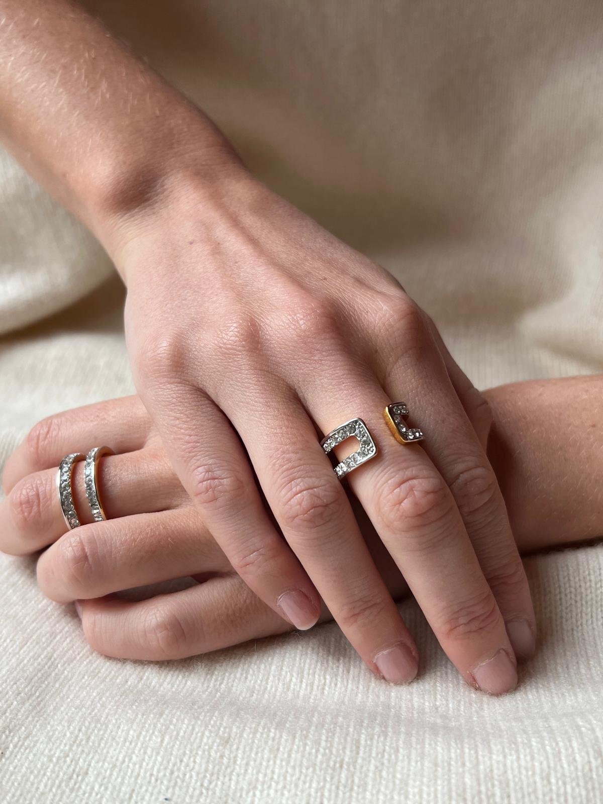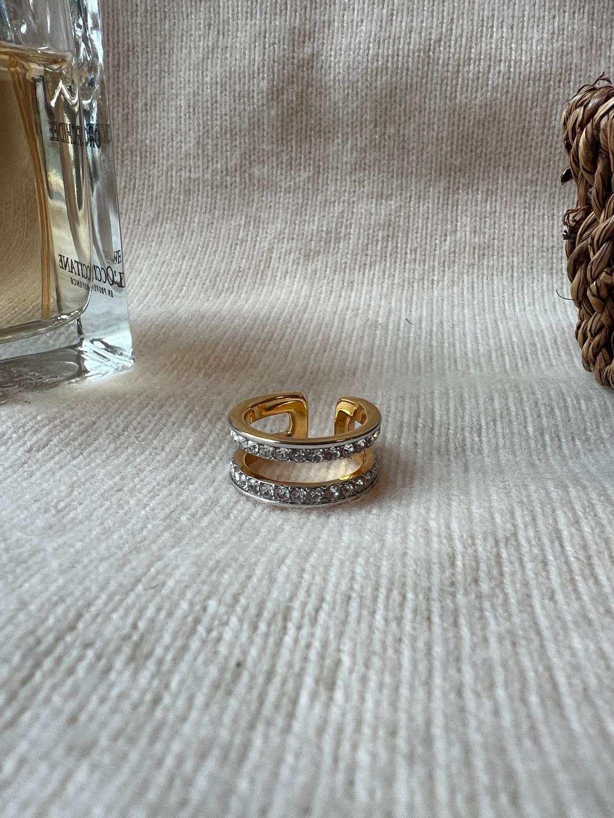 Magnifique bague double-anneau deux tons, les anneaux sont habillés d'or 750 ‰ sur la face extérieure et en argent rhodié à l’intérieur (plus résistant). Ornée de cristaux éclatants, cette bague double-anneau brillera de mille feux à votre doigt. Vous pouvez la porter de deux façons selon vos envies. Taille 57 légèrement réglable .Livrée en pochette suédine.
