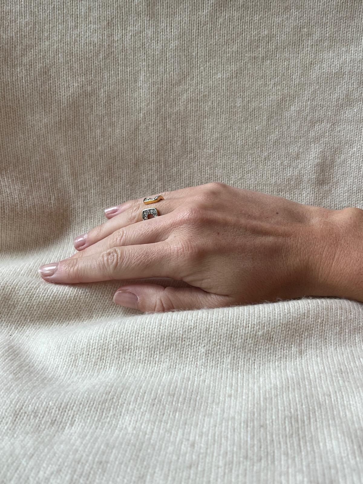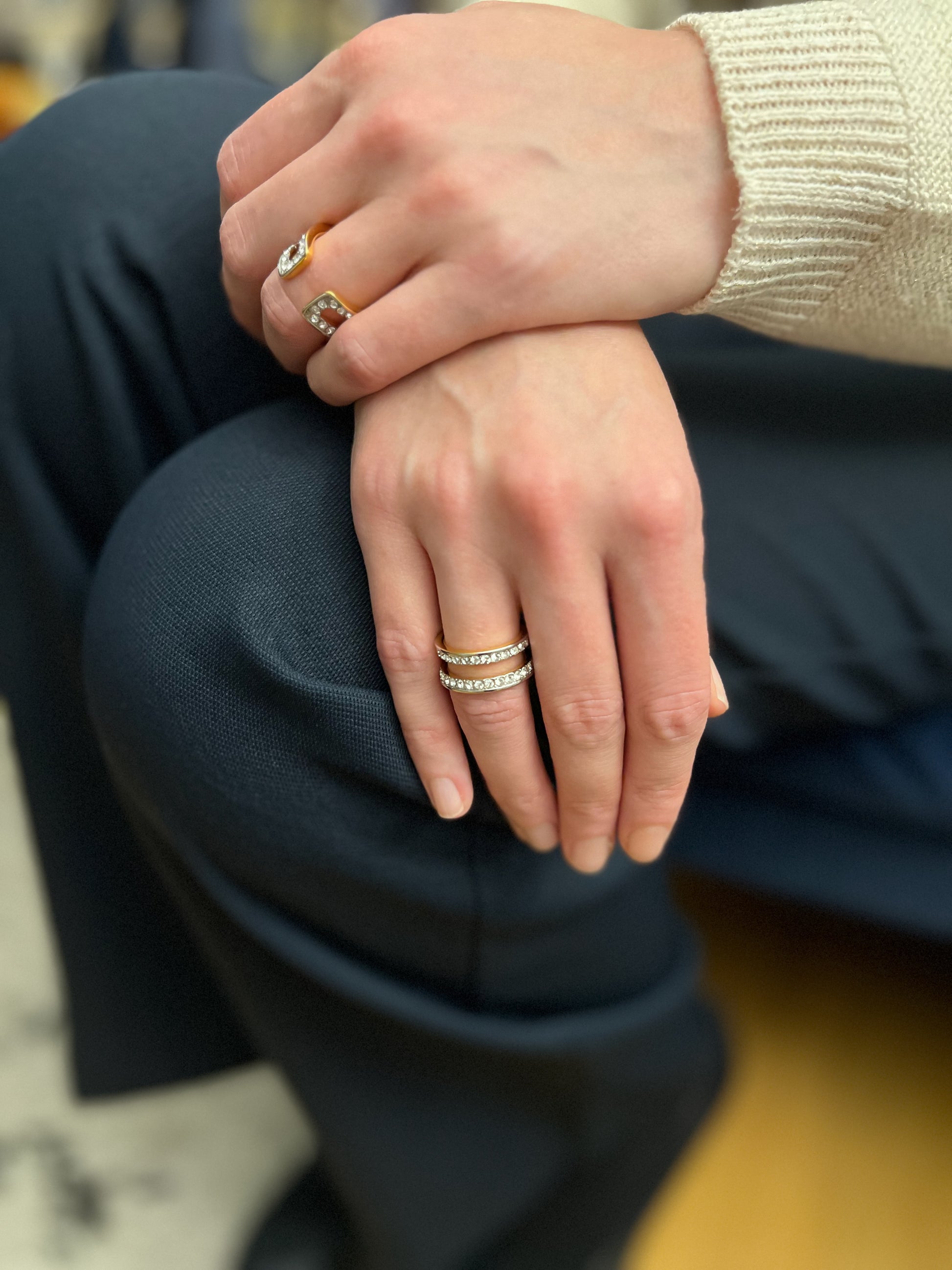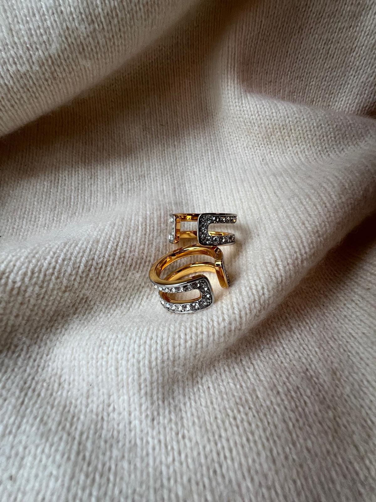 Magnifique bague double-anneau deux tons, les anneaux sont habillés d'or 750 ‰ sur la face extérieure et en argent rhodié à l’intérieur (plus résistant). Ornée de cristaux éclatants, cette bague double-anneau brillera de mille feux à votre doigt. Vous pouvez la porter de deux façons selon vos envies. Taille 57 légèrement réglable .Livrée en pochette suédine.