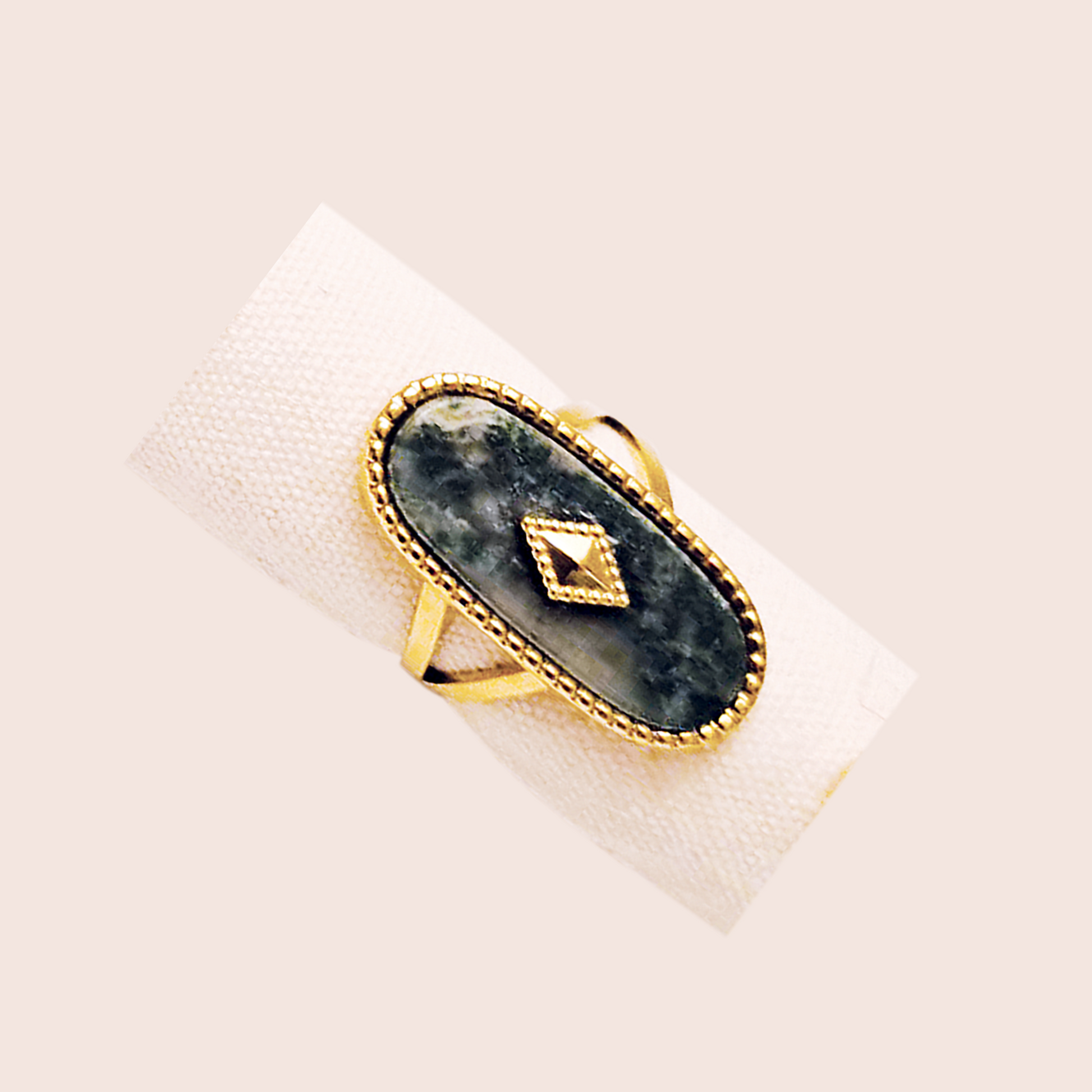 | Beau bijou de style Second Empire avec son losange festonné sur pierre fine d'agate rouge ou sur pierre fine de spinelle noire. Métal doré ou fin. Réglable 2,8 cm |