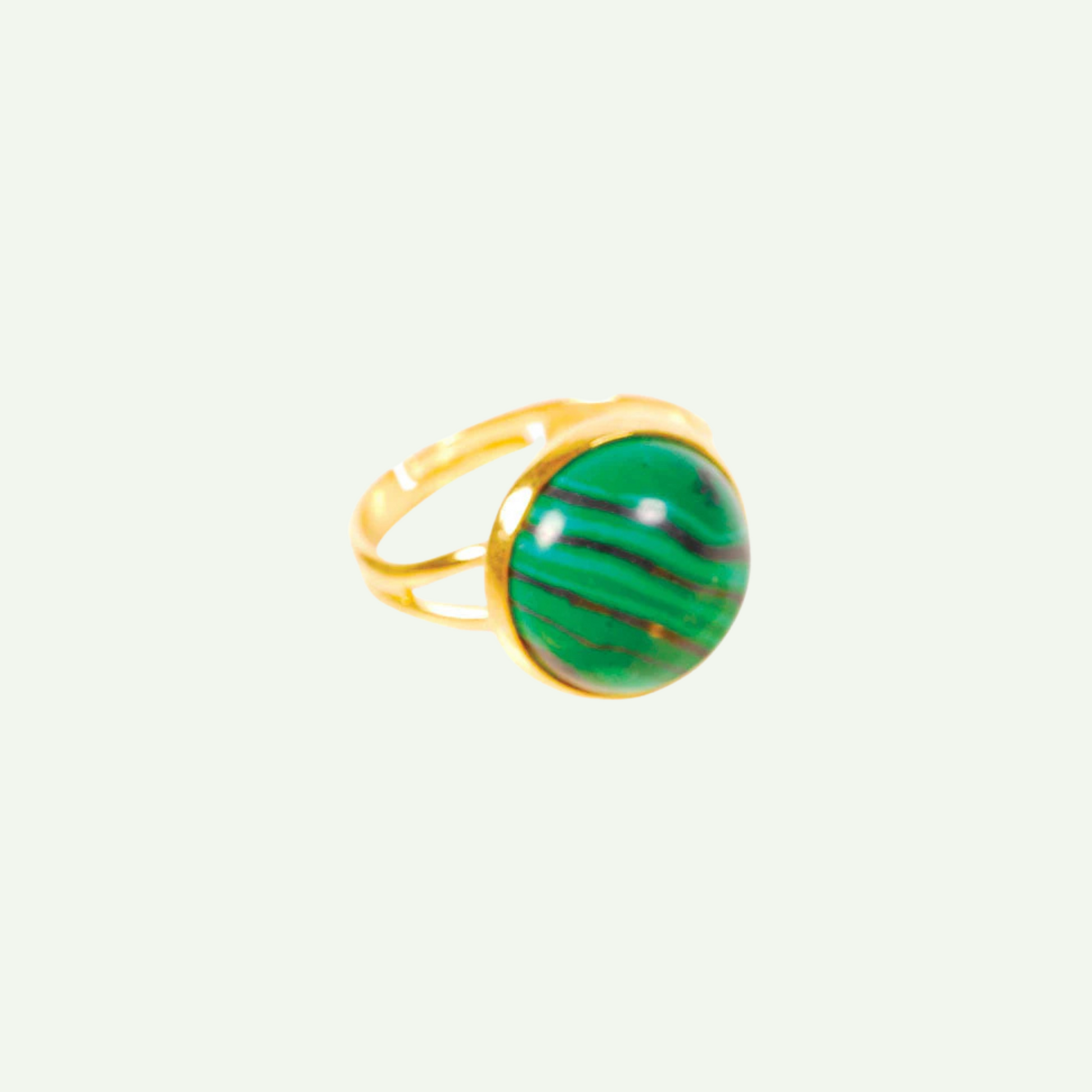 Cette bague discrète se porte indifféremment seule ou accompagnée. Sa monture dorée met en valeur sa belle pierre d’un diamètre de 12 mm. Bague réglable
