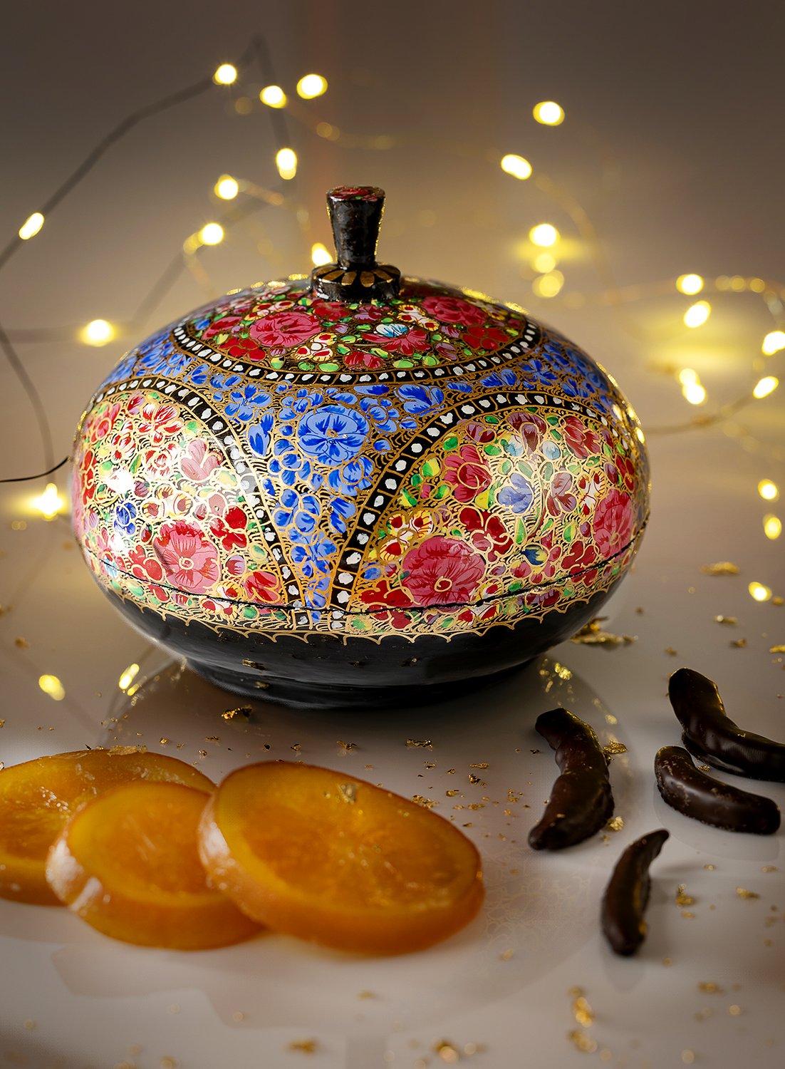 Entièrement fabriquée et peinte à la main, cette Magnifique boîte D. 15,5 cm, accueille 90 grs d’orangettes chocolat noir. Une occasion festive d’exception, un très beau cadeau ! Cet artisanat traditionnel du Cachemire est originaire de Perse. Depuis le XVIe siècle les artisans perpétuent ce savoir-faire de l’époque moghole.