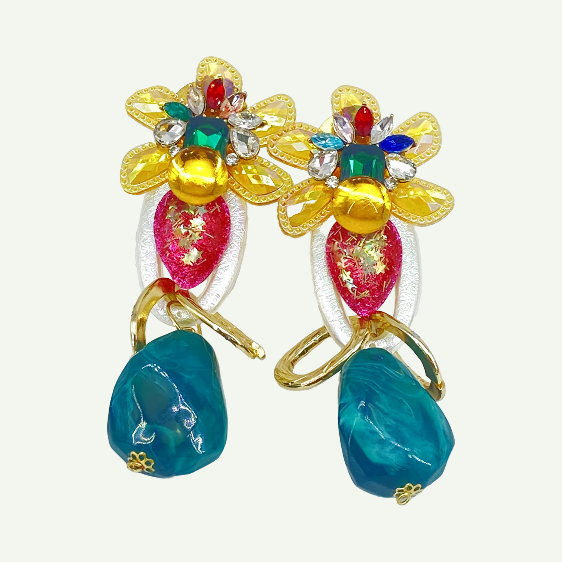 Très colorées, cette création originale réalisée par une artiste de talent en exclusivité pour « Inspiration Musées » est Superbe ! Fabrication artisanale de qualité Métal doré or fin. 10,5 x 4 cm. Oreilles percées