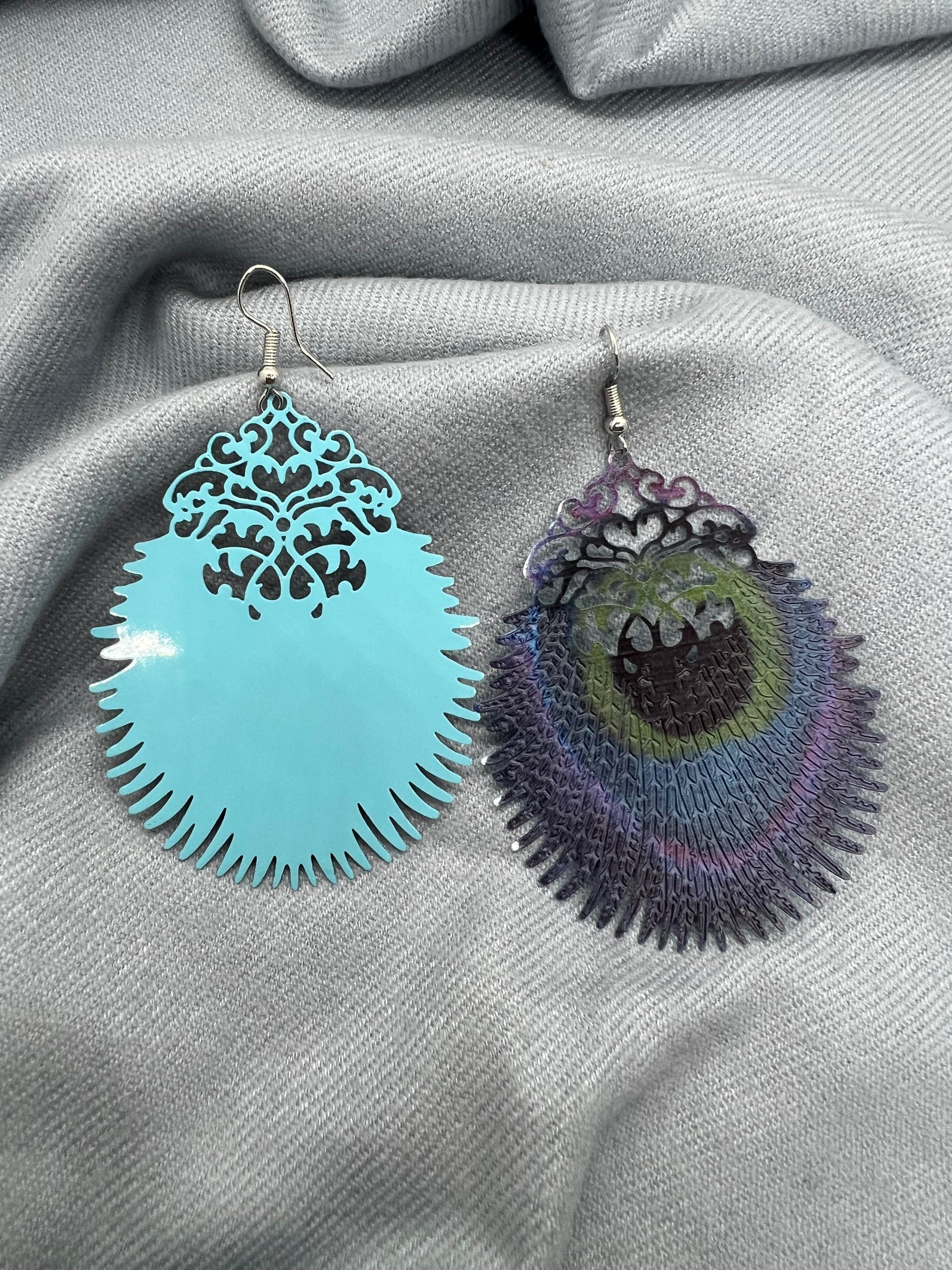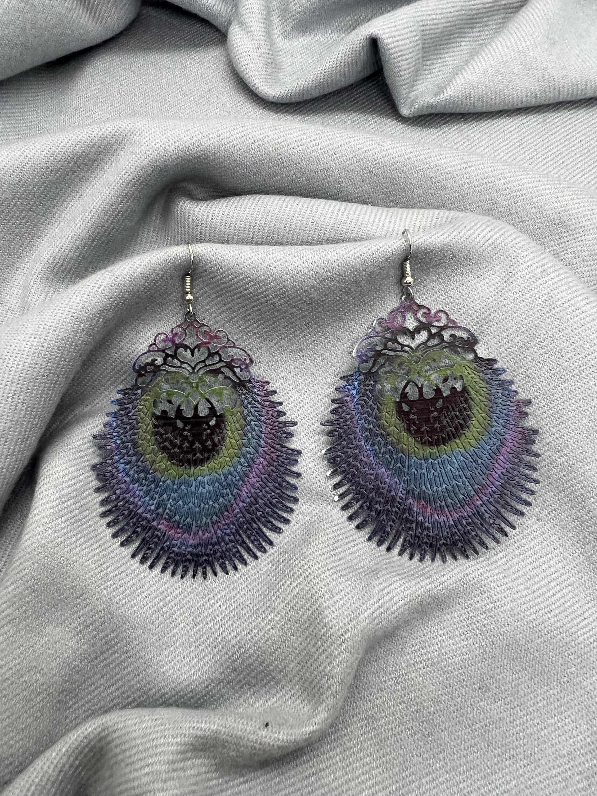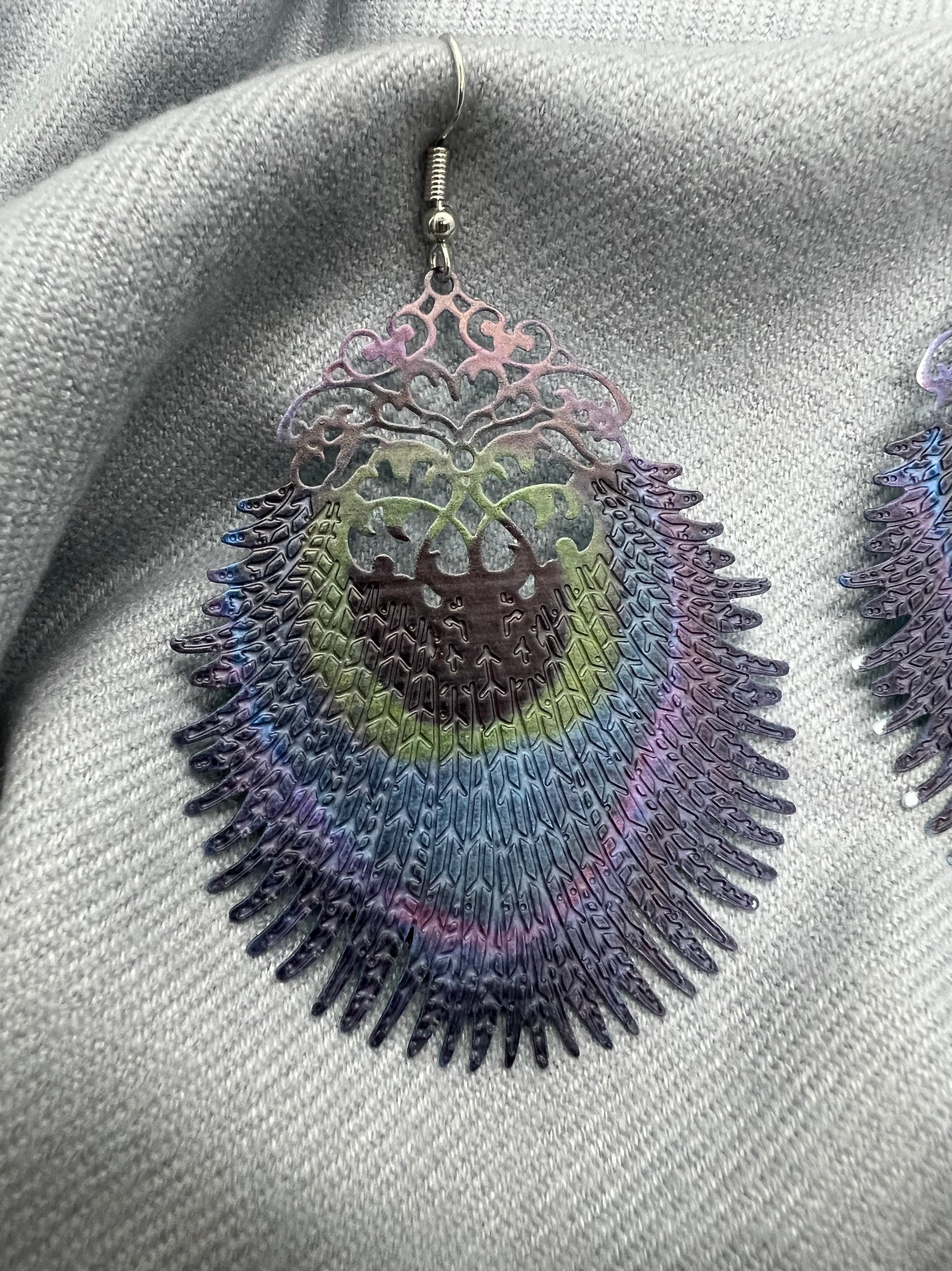 Plumes, rinceaux : ces boucles d’oreilles, du plus bel effet, illustrent parfaitement le travail de ce groupe indigène de Colombie. Pour oreilles percées. 6 cm