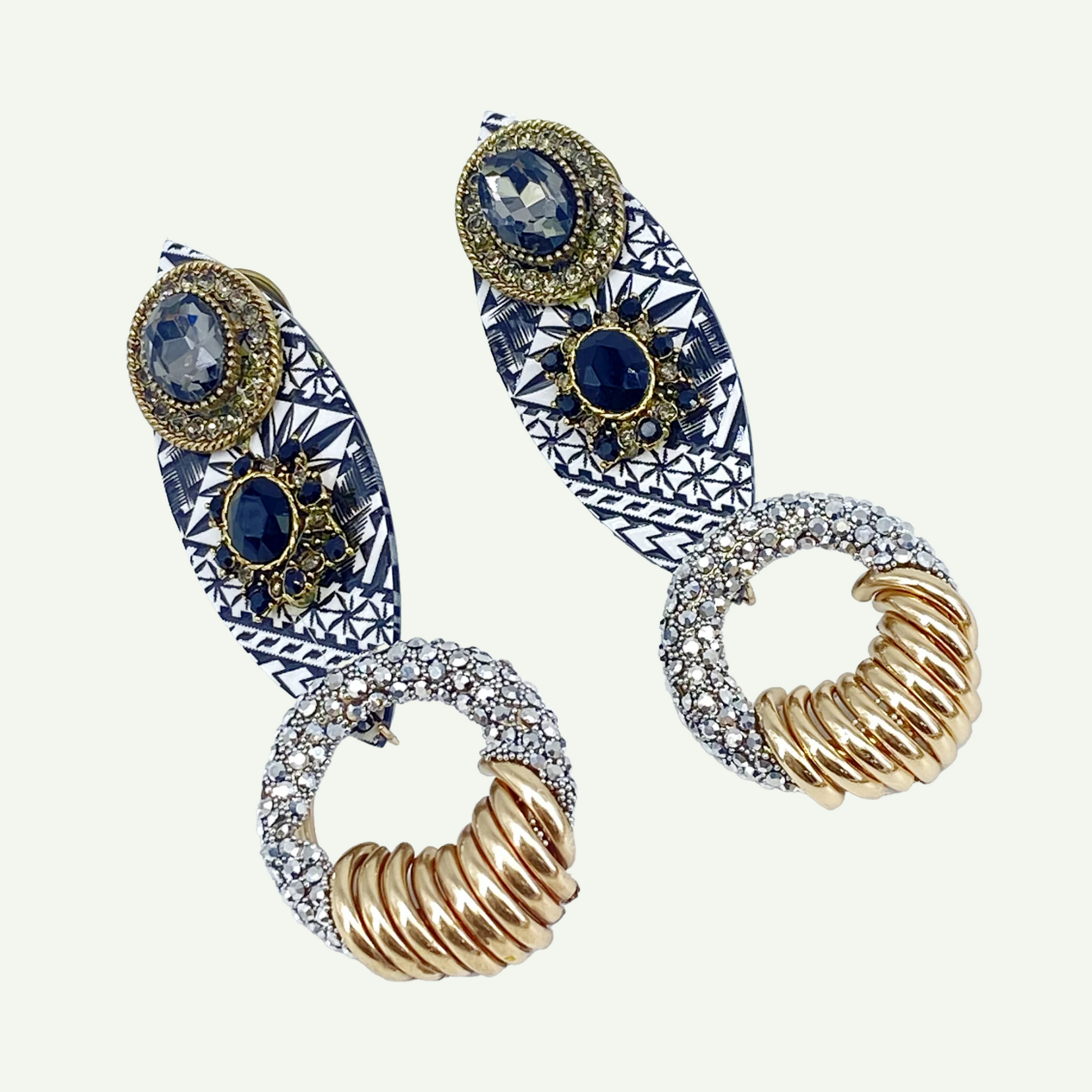 Inspirée des bijoux princiers en émail cloisonné et pierres précieuses, cette création originale réalisée par une artiste de talent en exclusivité pour « Inspiration Musées » est Superbe ! Fabrication artisanale de qualité Métal doré or fin. 9,5 x 3 cm. Oreilles percées.