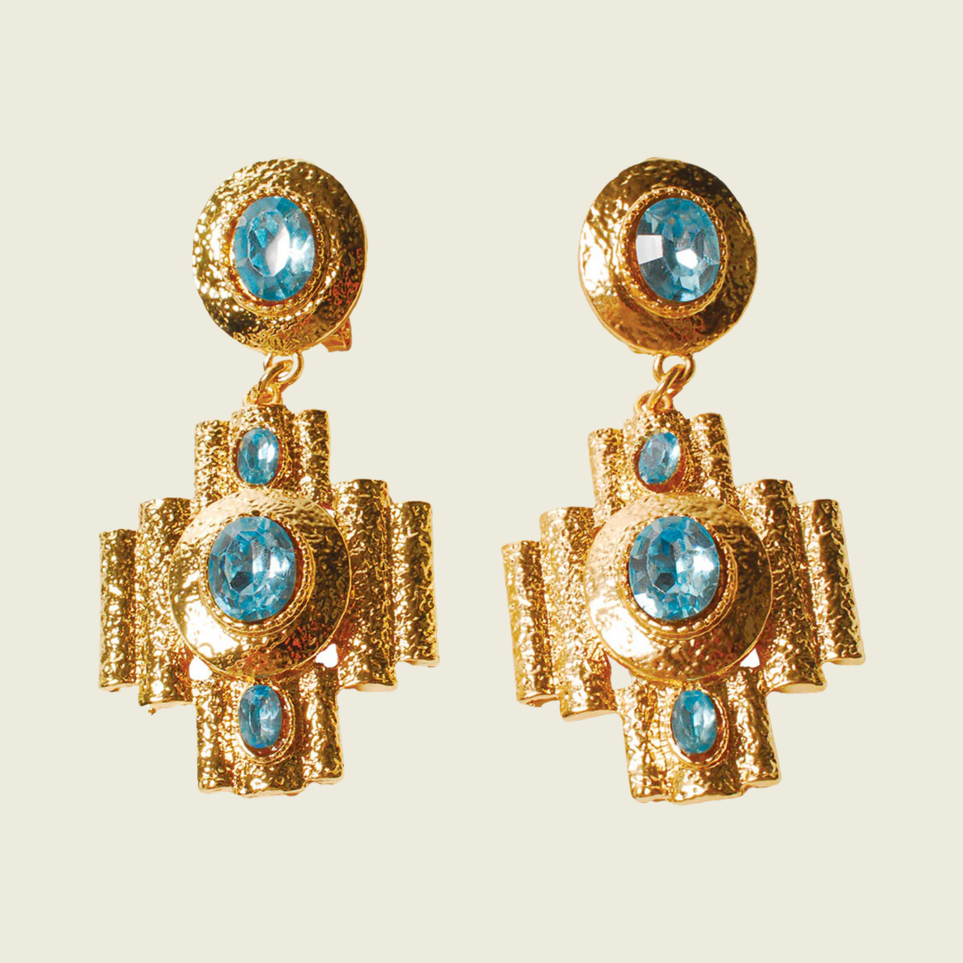 Ces boucles d’oreilles mélangeant or et Aigue Marine sont ravissantes ! Créées par une artiste de talent, elles sont inspirées par le style Romano baroque, un courant artistique qui s’est développé en Italie au XVIIe siècle. Métal doré or fin et cristal Aigue Marine – oreilles percées. L. 6,7 cm