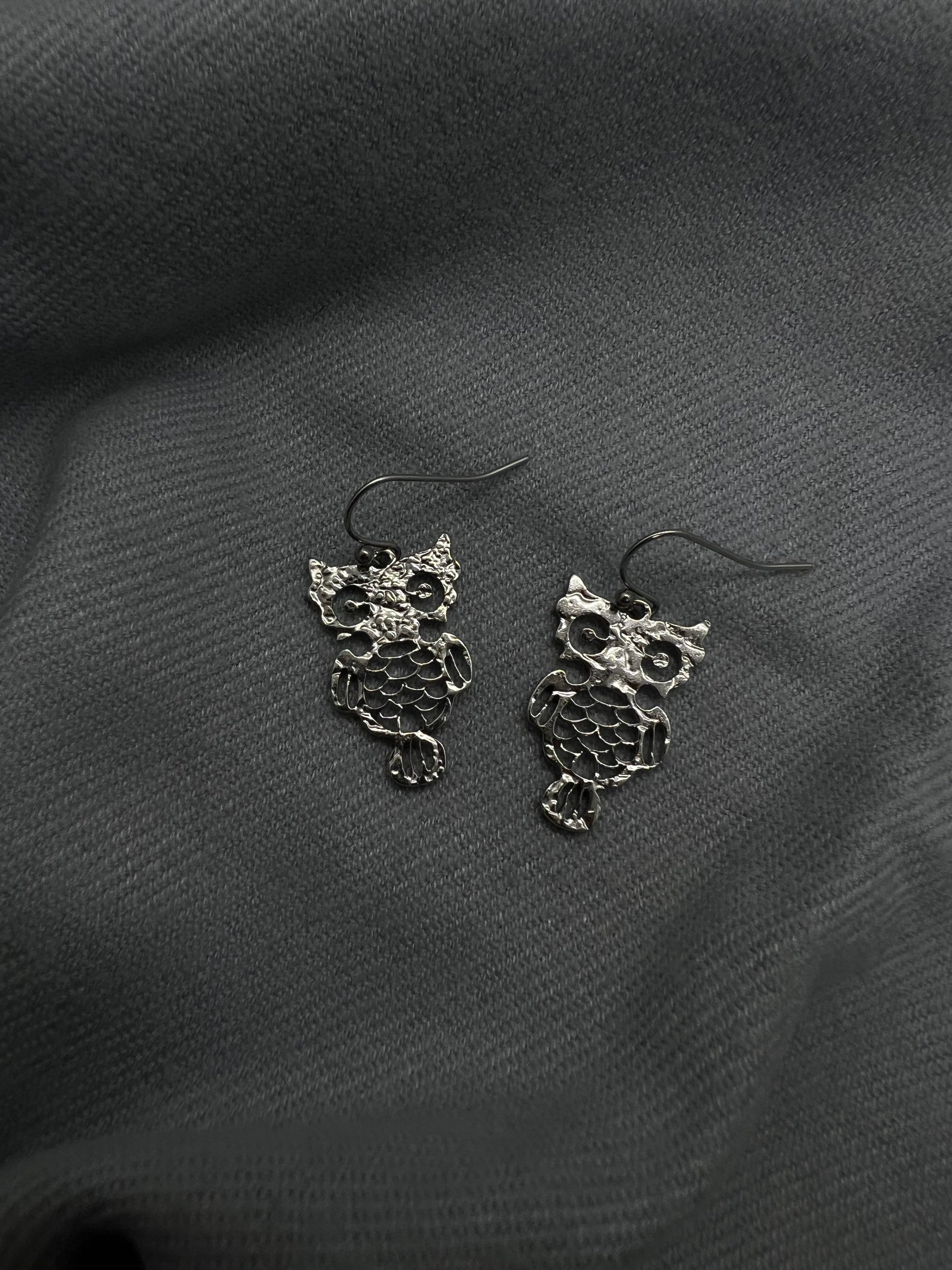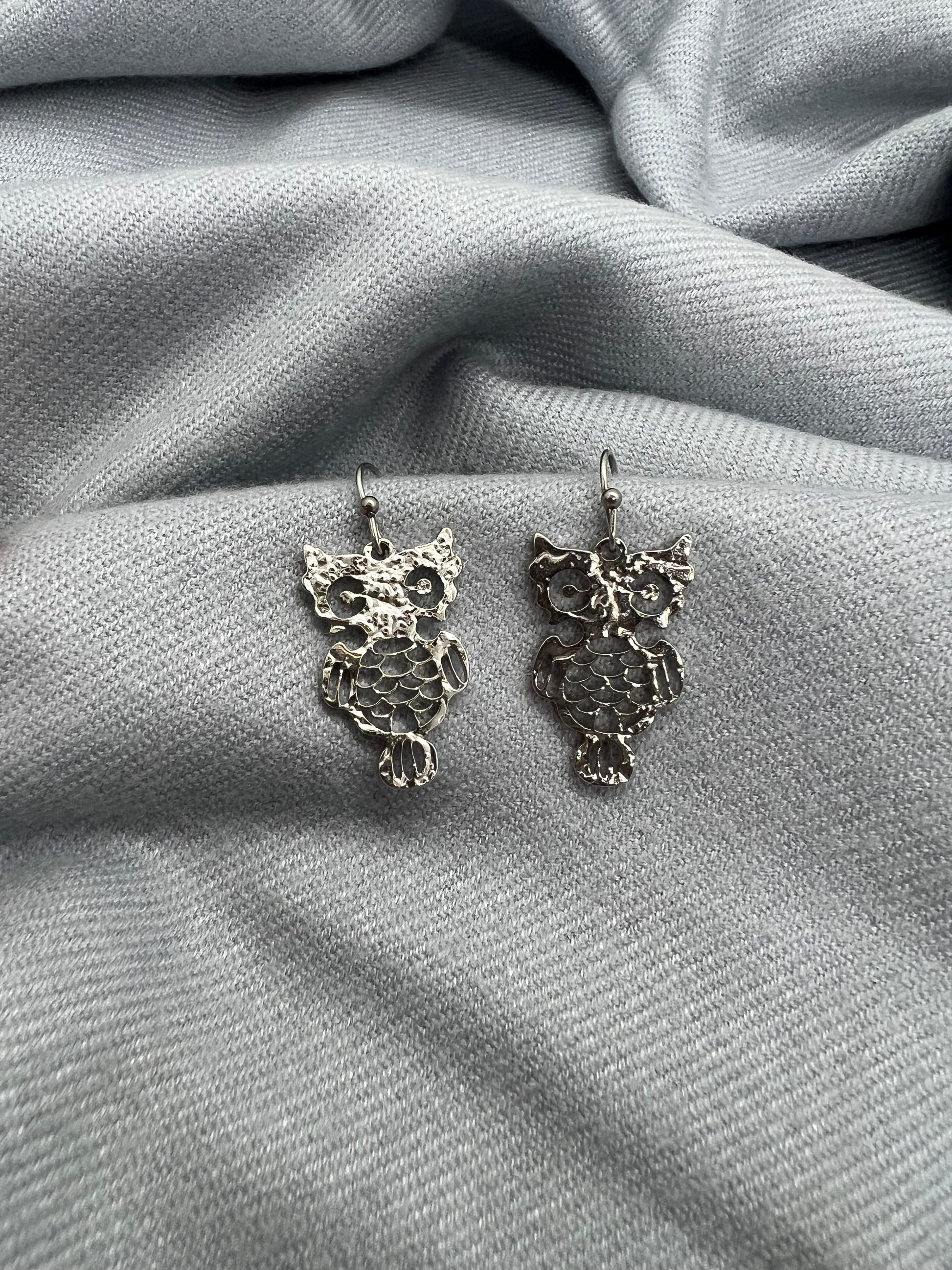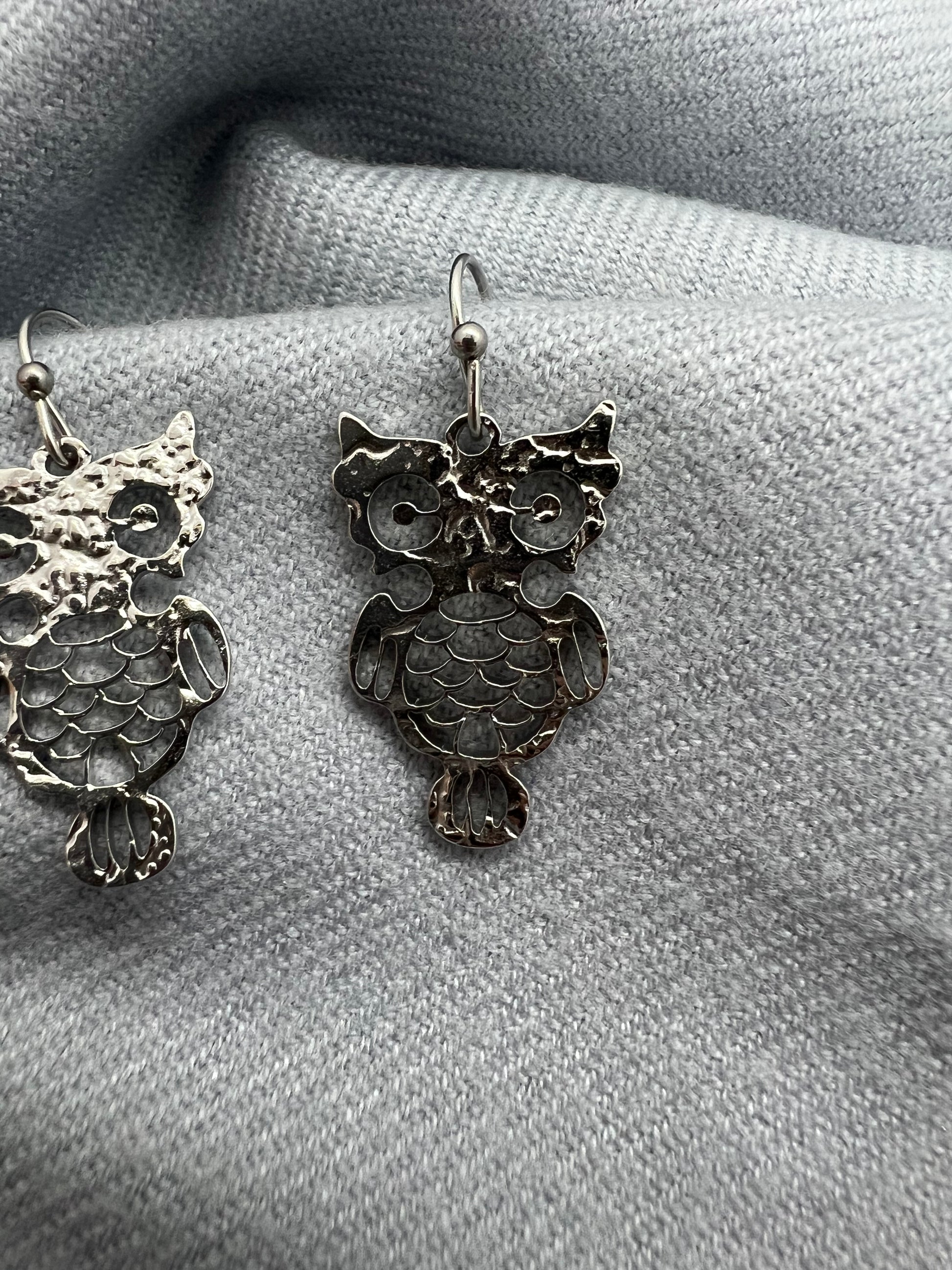 | Adorable petit hibou délicatement ajouré. Belle création d'acier argent. Oreilles percées. 2,5 cm |