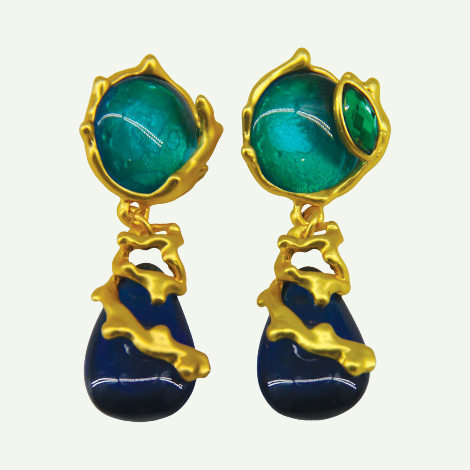 Des bleus somptueux pour un bijou lié à l’été et aux océans lointains. Métal doré or fin. Clips. 6,5 cm
