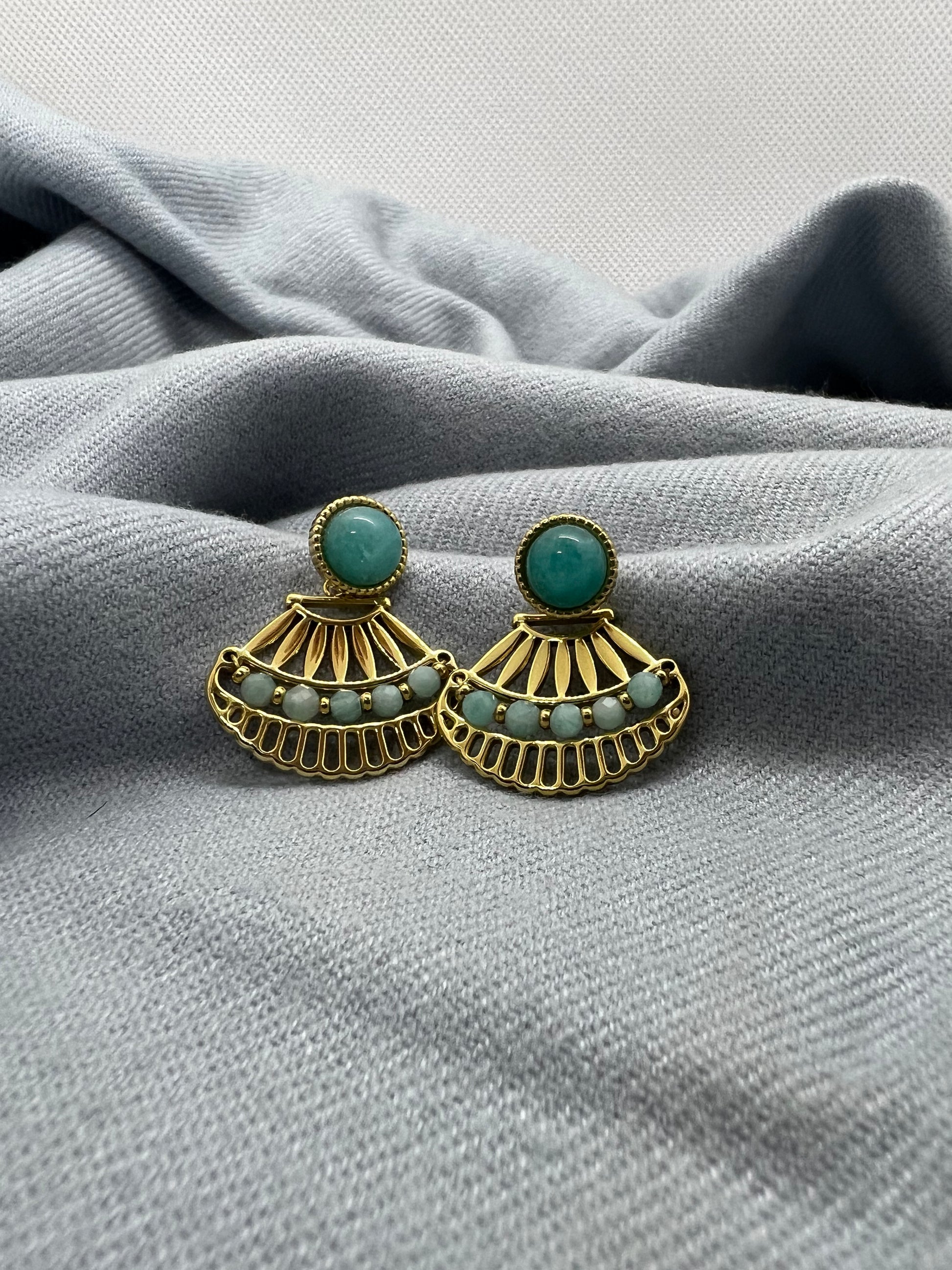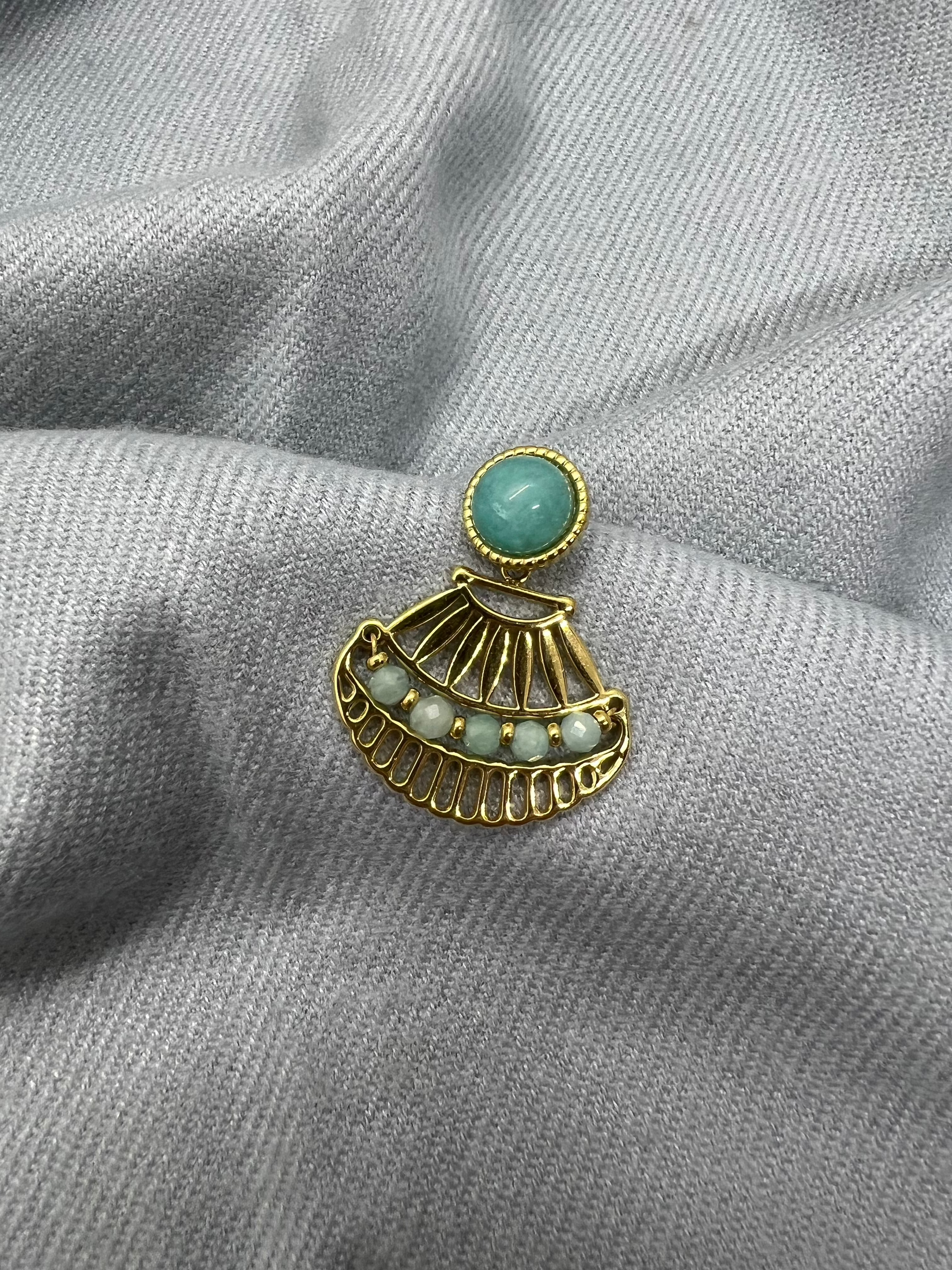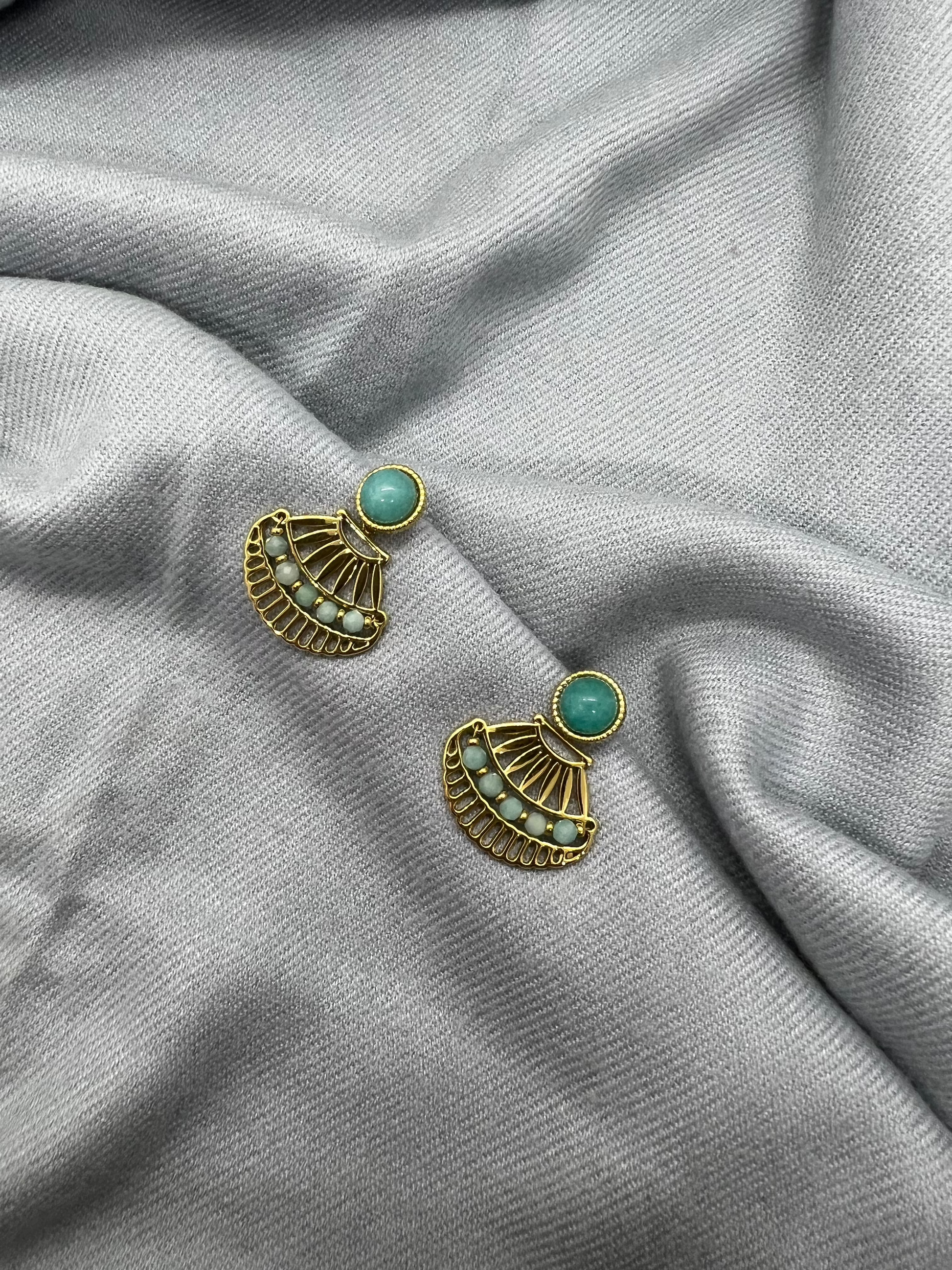 Superbes coquilles serties d’apatite bleue, pierre reconnue comme source de confiance en soi. Depuis l’antiquité la coquille est symbole de chance, de purification spirituelle et de résurrection d’où les cuves de fonts baptismaux en forme de coquille. Acier inoxydable doré à l’or fin - oreilles percées. H. 3 cm