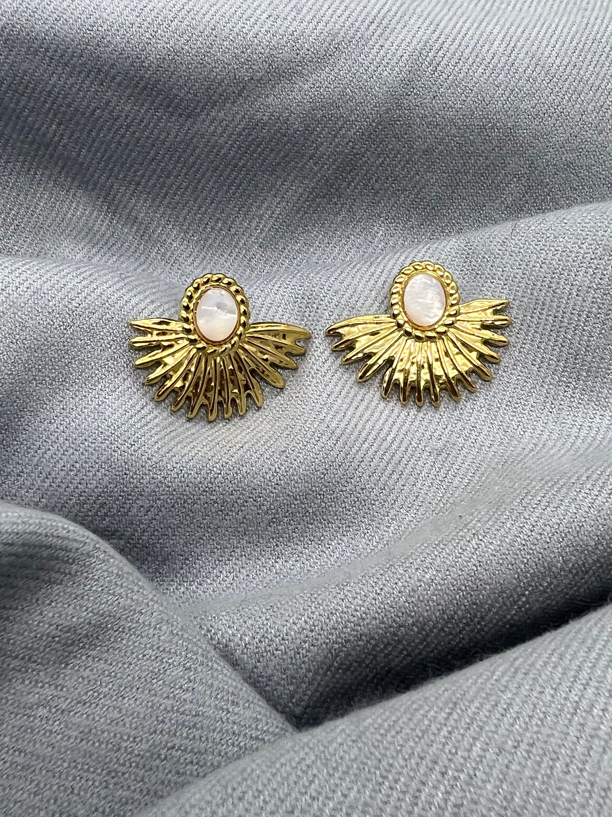 Nacre d’une belle pureté, superbement sertie de rayons solaires, pour briller de tous vos feux. Acier doré or fin. Oreilles percées. 3 cm