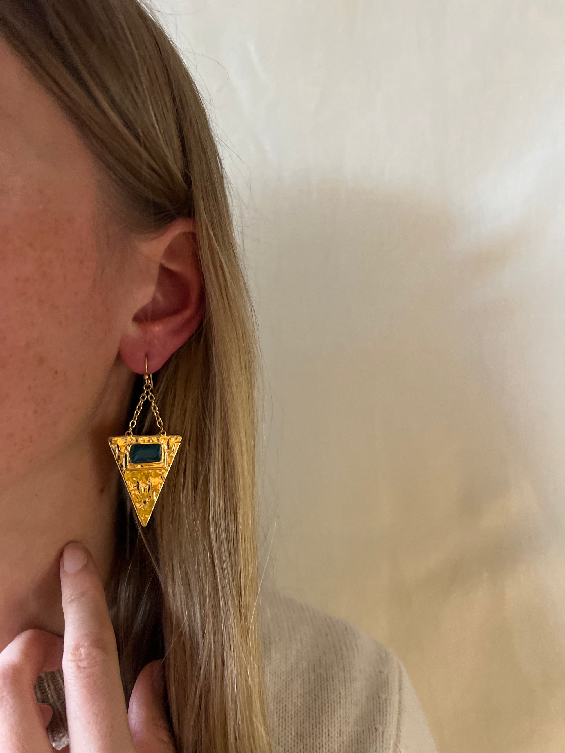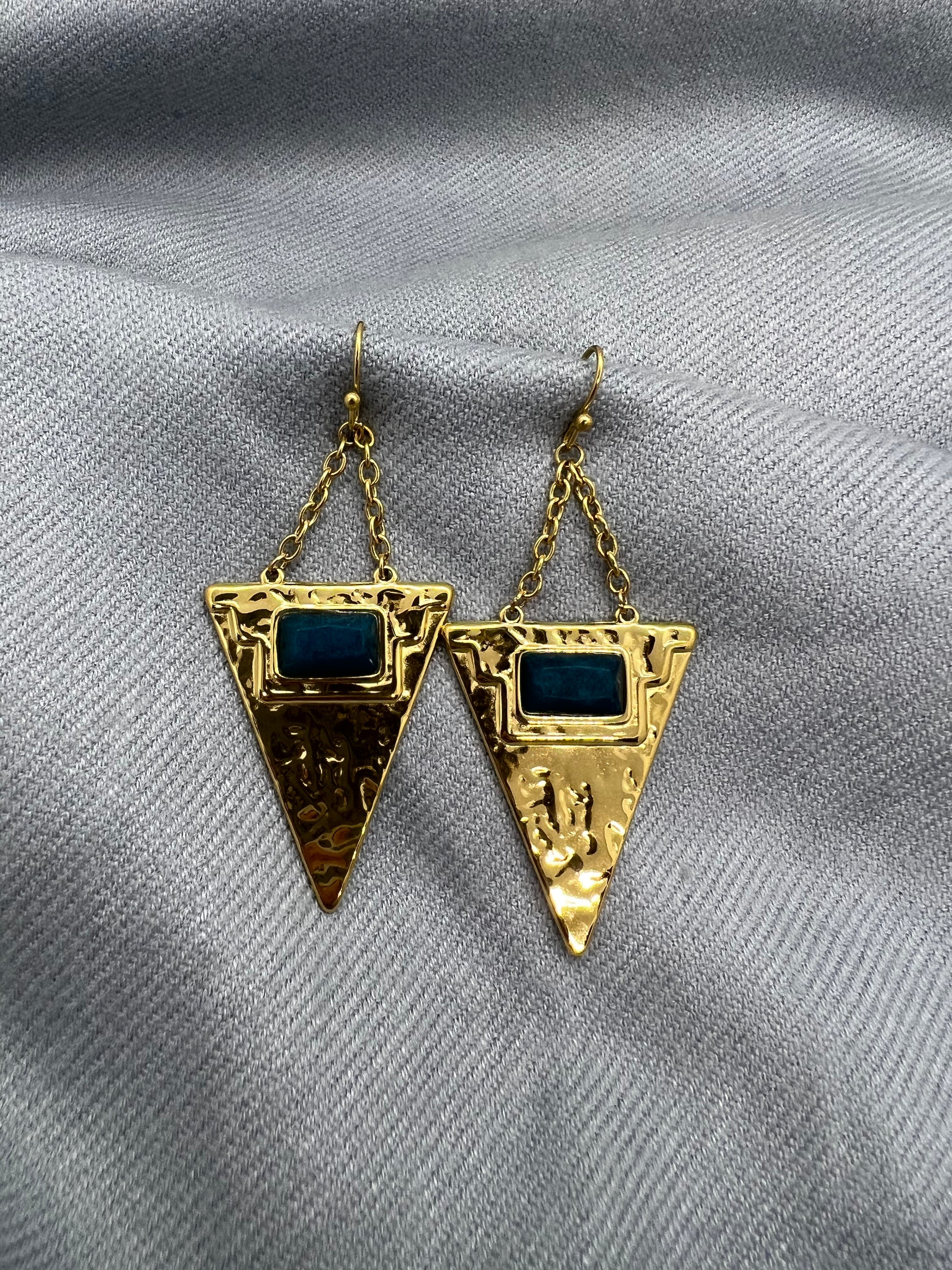 Beaucoup de style pour des BO ornées d’apatite bleue, pierre reconnue comme source de confiance en soi. Acier inoxydable doré or fin. Oreilles percées. 3 x 3,5 cm