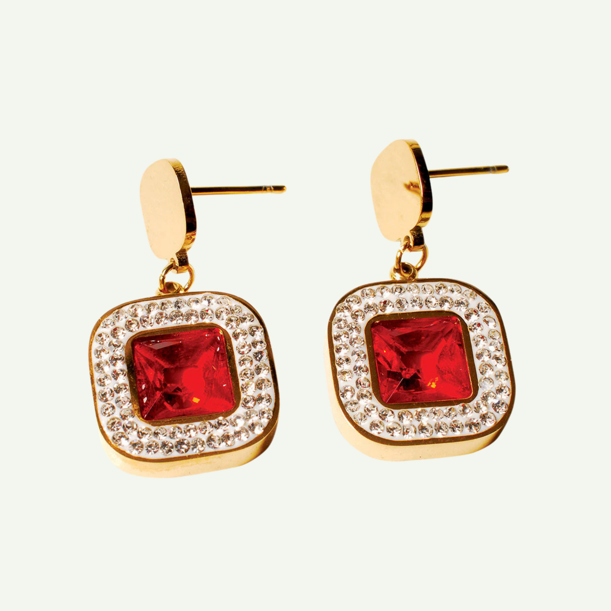 Un style classique dans toute sa beauté ! Cristal rubis facetté, strass, bijou en acier doré. Boucles pour oreilles percées. 2,5 cm