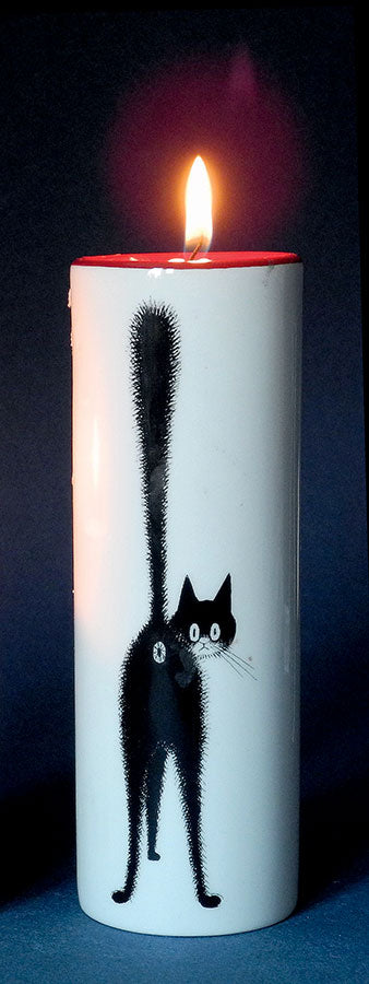 Pot à bougie en céramique, illustré du célèbre chat de Dubout. H. 15 cm