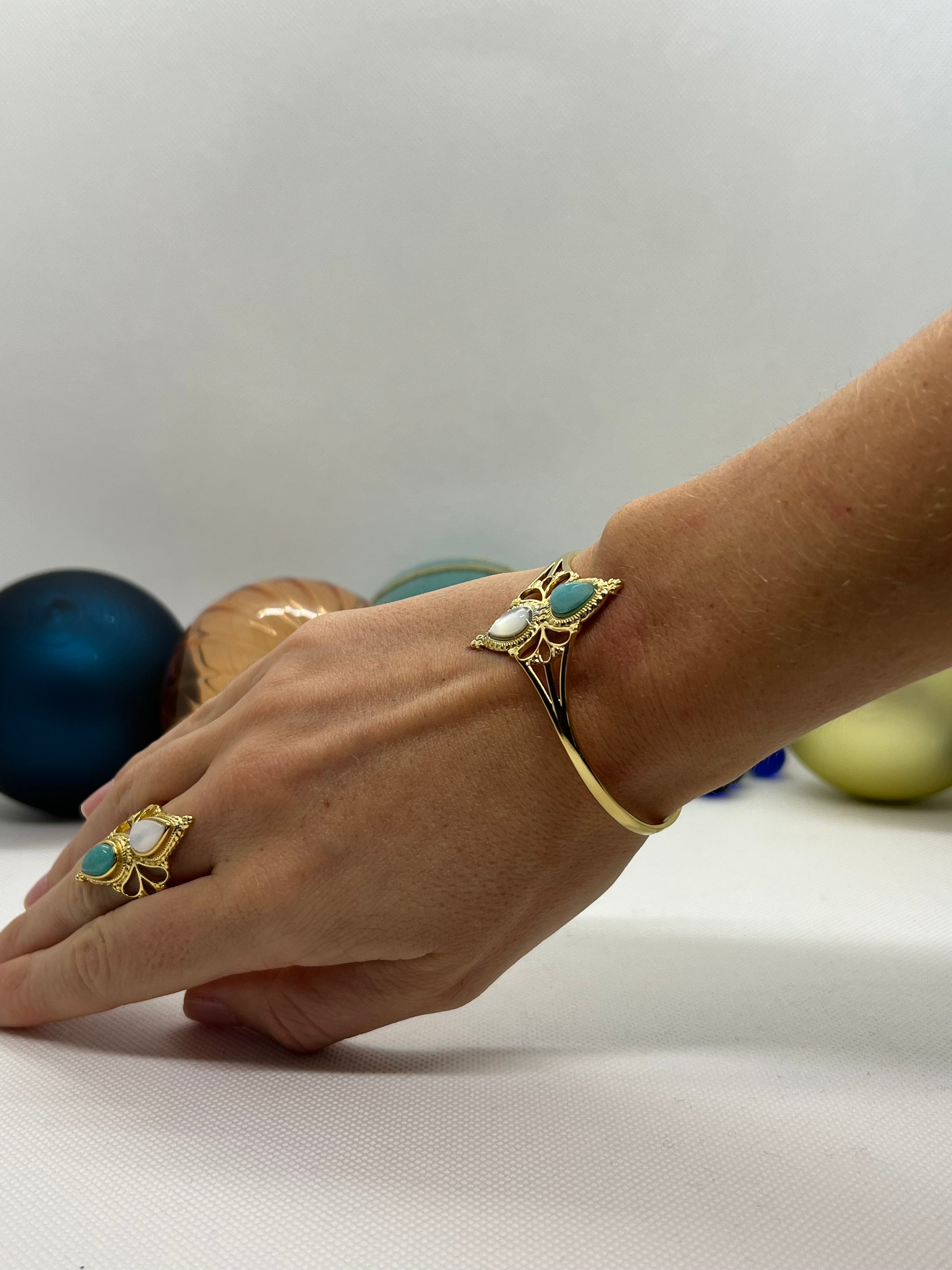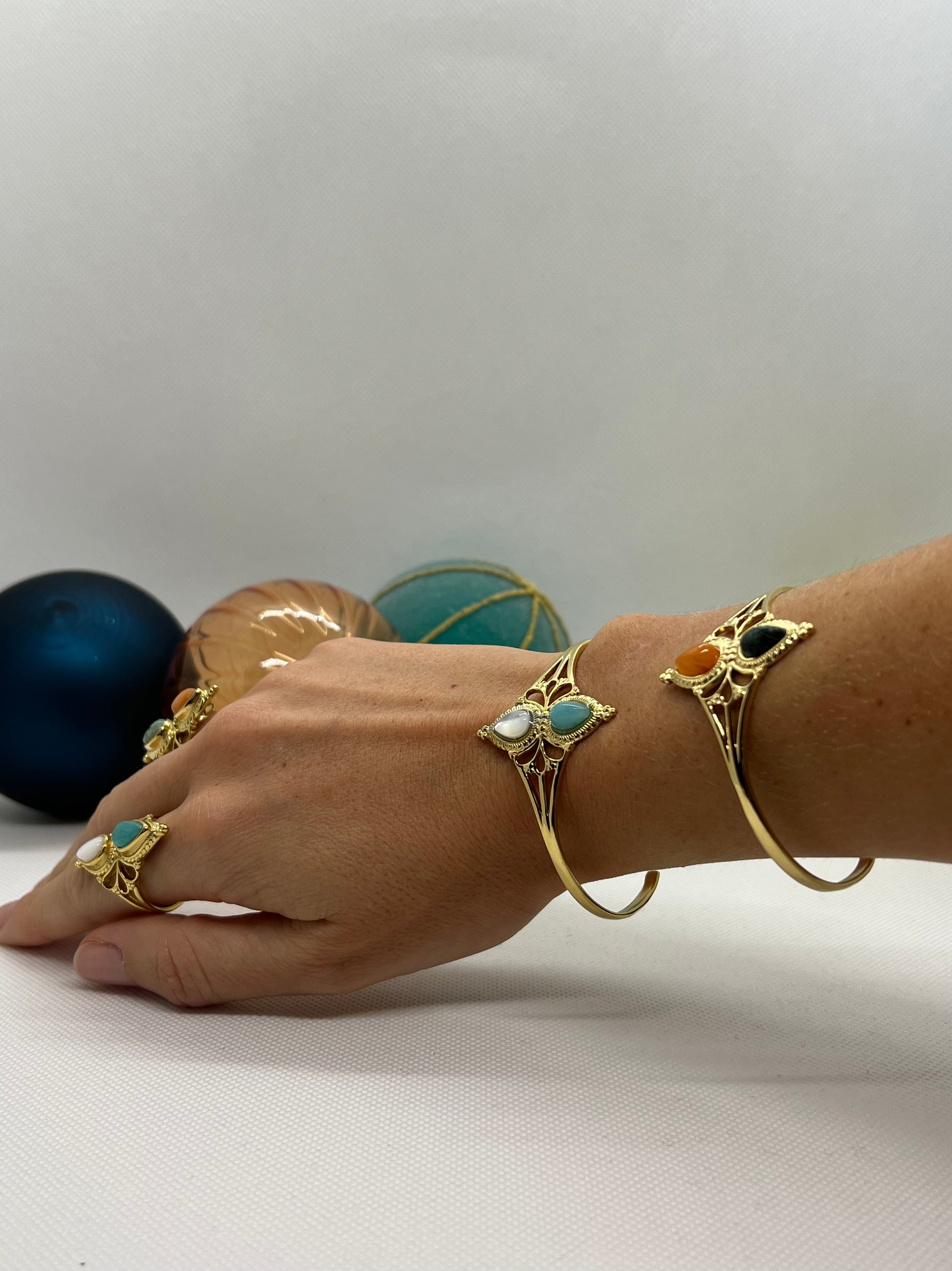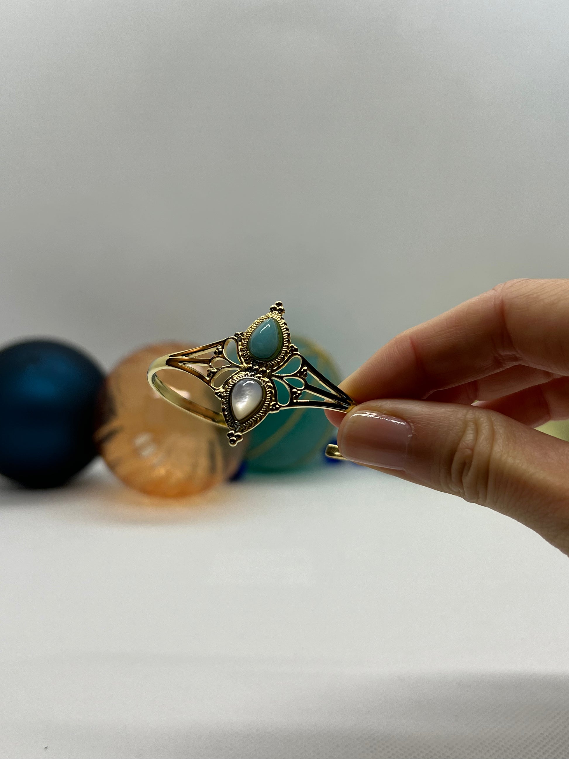 Cette parure est très belle, réalisée à la main avec soin et finesse. Deux pierres fines aux vertus énergétiques et protectrices (Nacre et Amazonite) en forme de tenue gouttent le regard. Leur entourage d'arabesques s'inspire des œuvres de l'artiste tchèque Alphonse Mucha, considéré comme l'un des maîtres de l'Art nouveau.