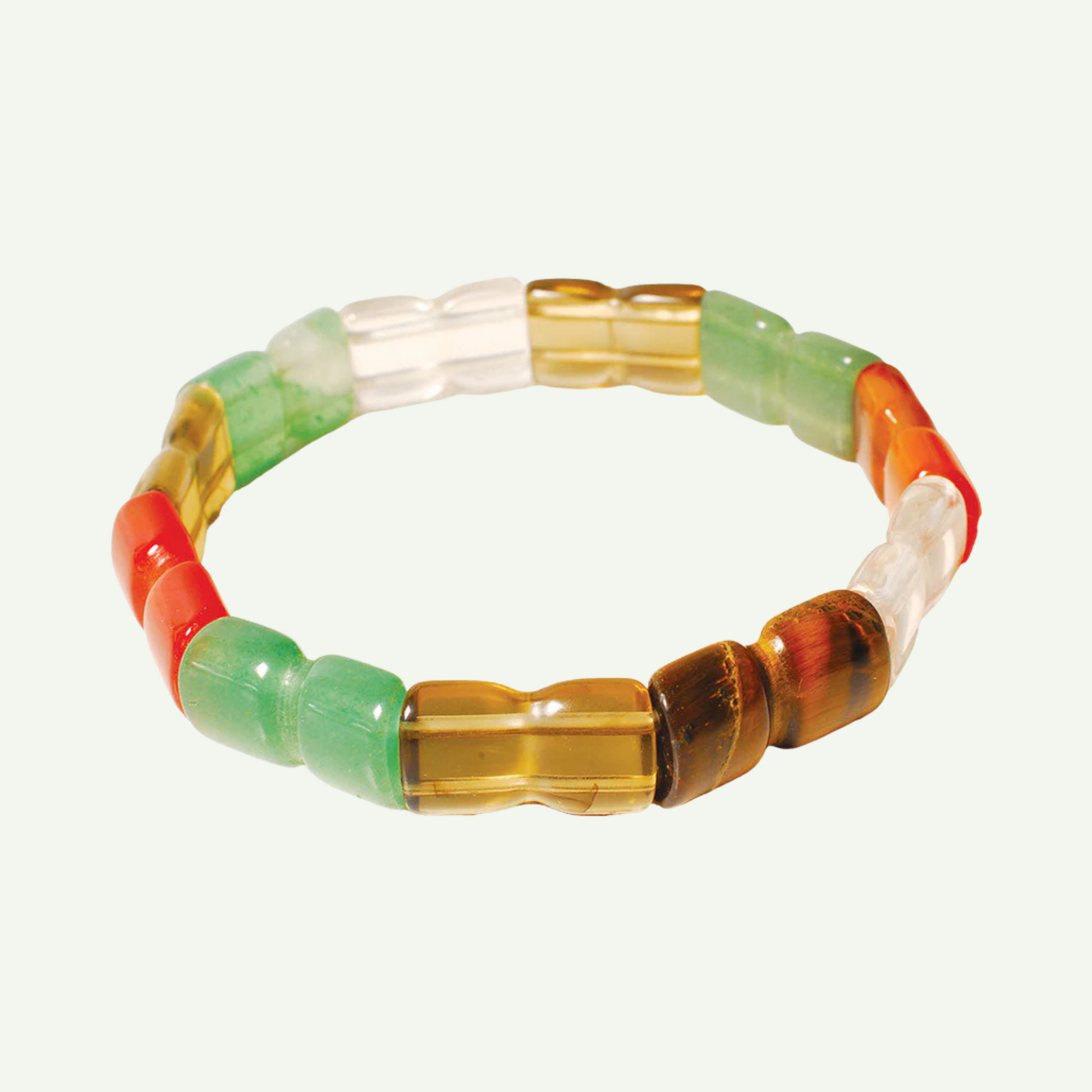 La forme rectangulaire de ces pierres précieuses (Jade, cristal de roche, œil de tigre, citrine) avec un pincement au milieu des deux grands côtés, au-delà du bien être apporté, a une signification symbolique, celle de la dualité du Yin et du Yang. Ce bracelet nous invite en permanence à adopter une vision plus holistique et plus nuancée de la réalité. Elle nous rappelle que tout est relatif et que rien n’est absolu. Elle nous encourage à chercher l’harmonie entre les opposés, plutôt que de les affronter ou de les nier. Un très beau bracelet. Extensible il s’adapte à tous les poignets.