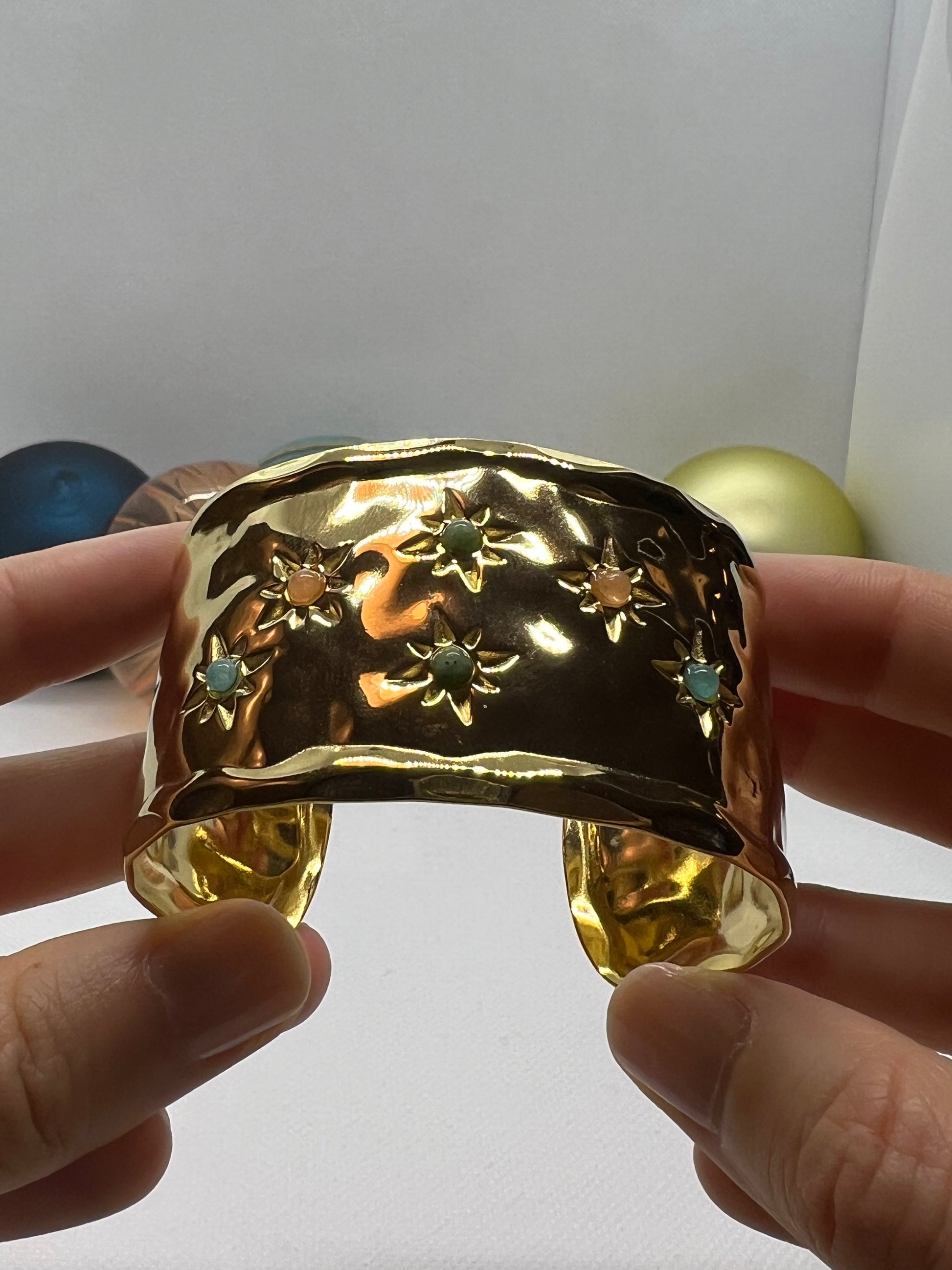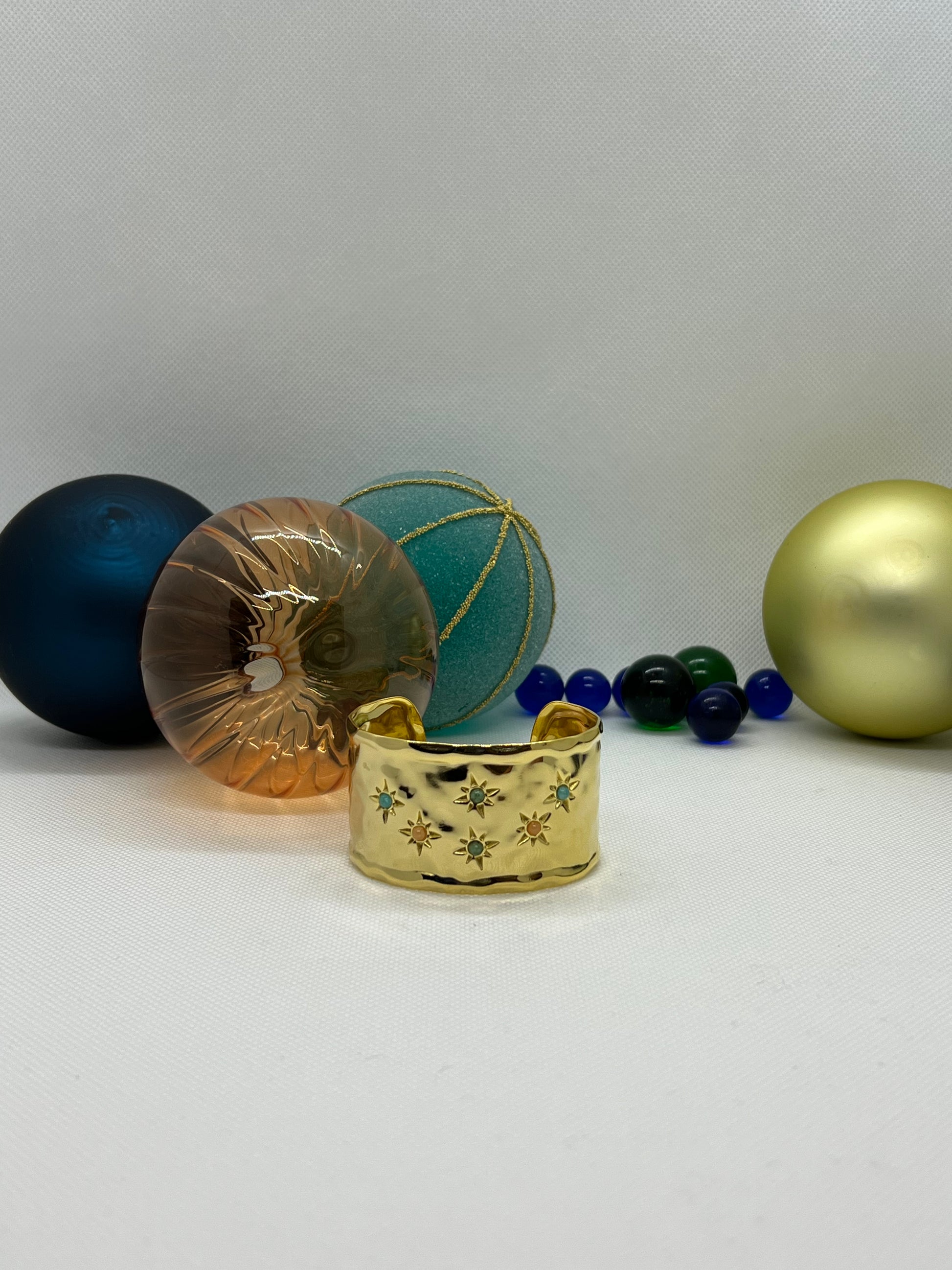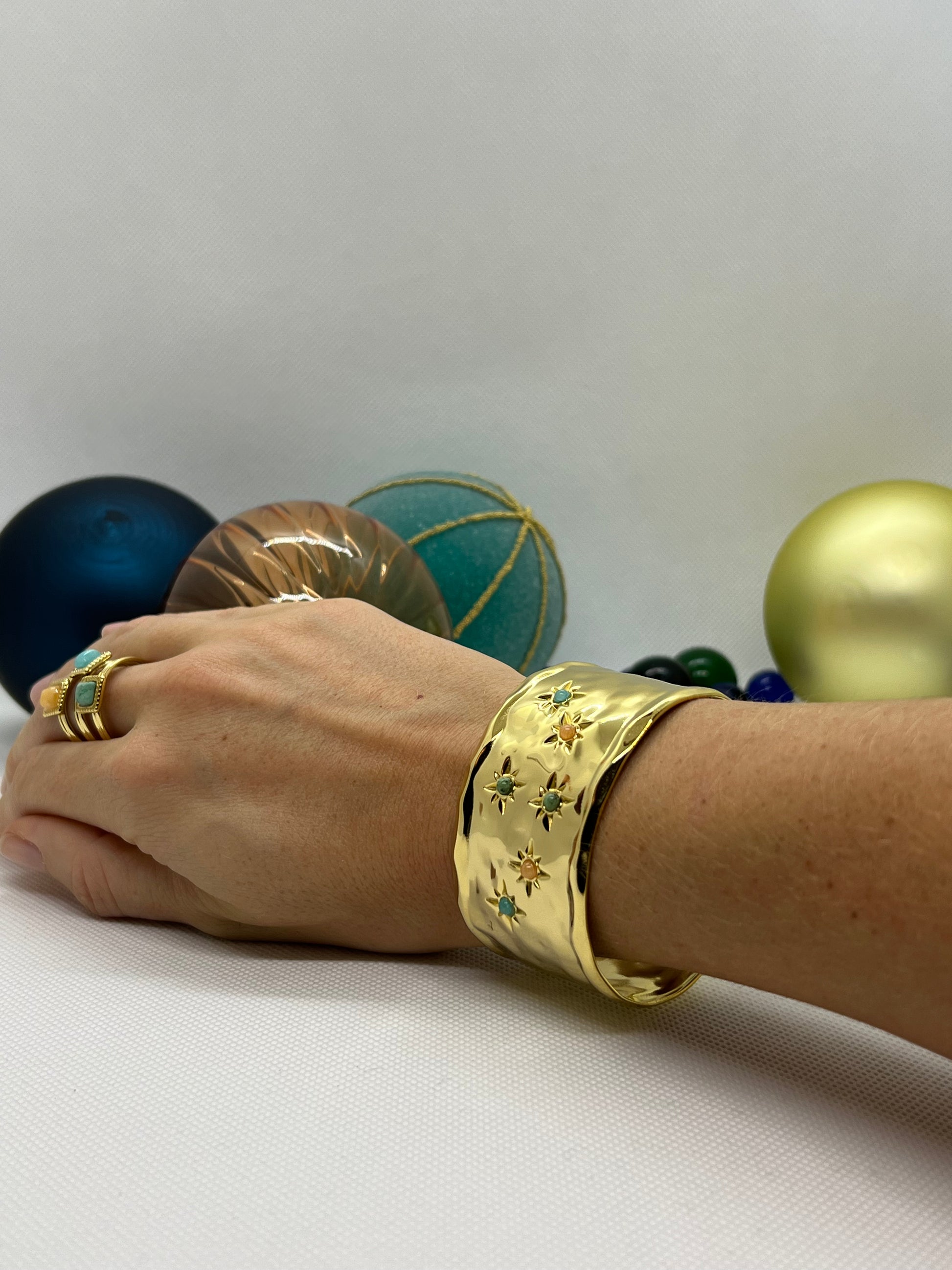 De belle largeur, ce bijou en acier inoxydable doré à l’or fin incrusté de petites pierres précieuses qui brillent dans un écrin d’or cosmique et magmatique est Magnifique ! Taille réglable, D. 3.5 cm. Agate orange, Turquoise Africaine, Amazonite. Création exclusive Inspiration Musées.