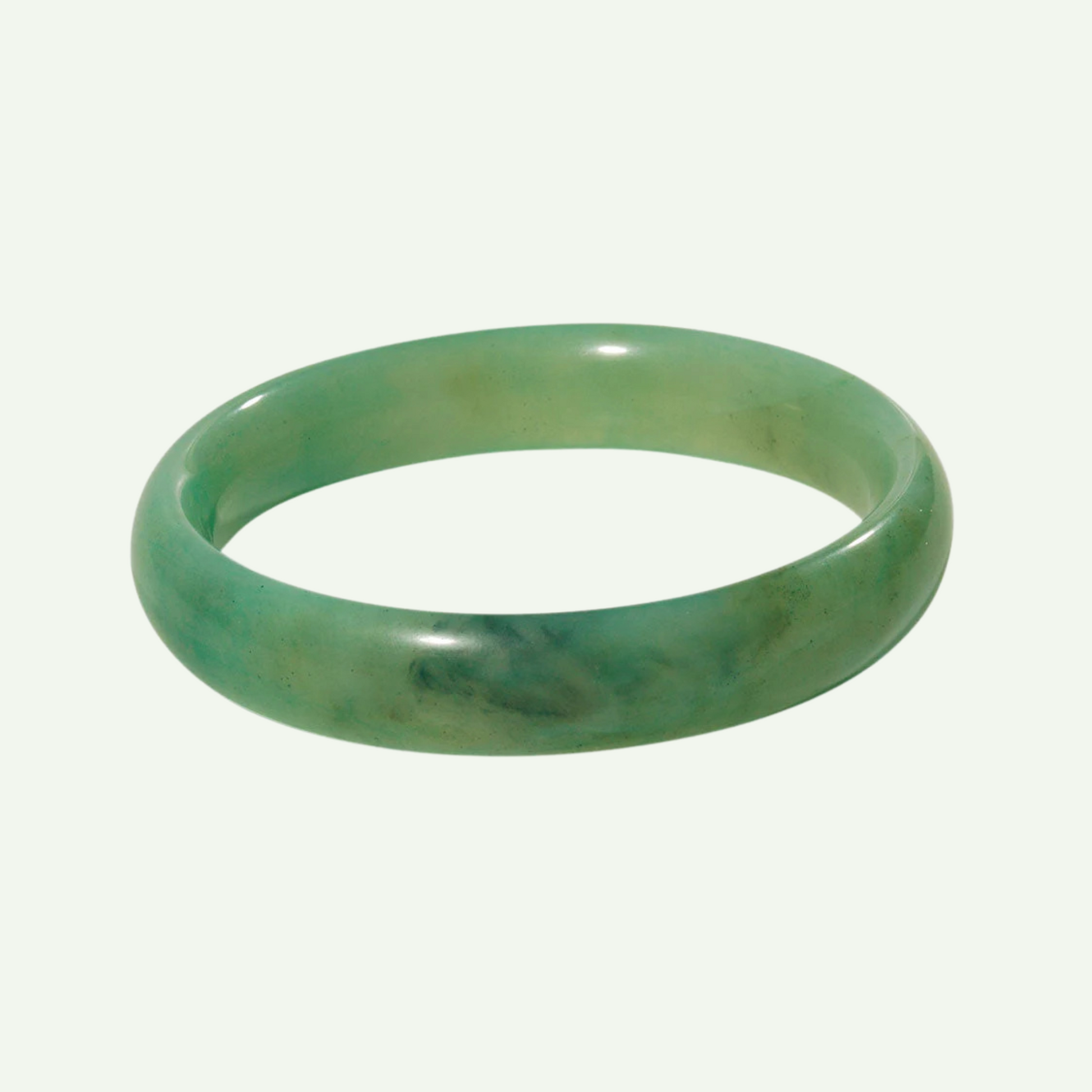 Ce magnifique bracelet réalisé en jade de Birmanie, particulièrement recherché pour sa qualité et sa dureté (il raye le verre), symbolise la droiture. Il reste l’une des pierres sculptée à la main, selon des méthodes ancestrales, les plus difficiles à travailler. Car comme le bois, le jade est vivant : frottez-le régulièrement pour lui conserver son éclat et ses propriétés étonnantes… Diam. intérieur : 6,5 cm. Diam. extérieur : 8,3 cm. L. 1,1 cm, P. 59 grs