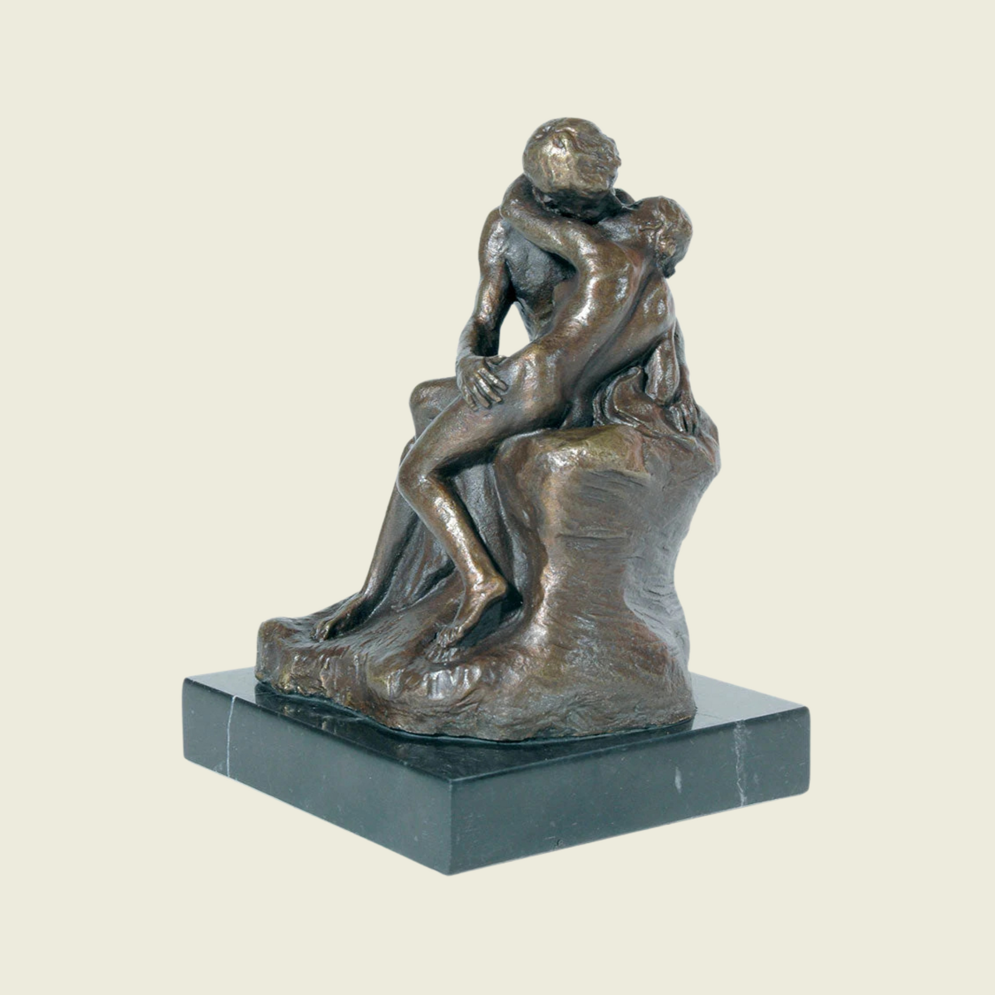 Tout comme Le Penseur, Le baiser est emprunté aux Portes de l’Enfer, l’œuvre de Rodin. Les personnages sont a l’origine basés après le mariage de Francesca avec le frère de Paolo. La statue du Baiser donne finalement une autre impression et exprime plus un amour libre et déclaré que le désespoir. Bien que très sensuelle, l’œuvre dégage également une certaine douceur, un certain charme innocent. Le Baiser a été envoyé par le gouvernement français pour être exposée lors de la World Columbian Fair à Chicago, mais les autorités américaines la trouvèrent trop osée pour l’exposer au grand public. Elle fut placée dans un local privé uniquement accessible sur autorisation spéciale. C’est peut-être le caractère secret de cette exposition qui fit le succés du Baisir, qui reste encore aujourd’hui l’une des œuvres les plus populaires de Rodin.Bronze patiné en résine. Stock limité. H. 24 cm, avec socle en marbre.