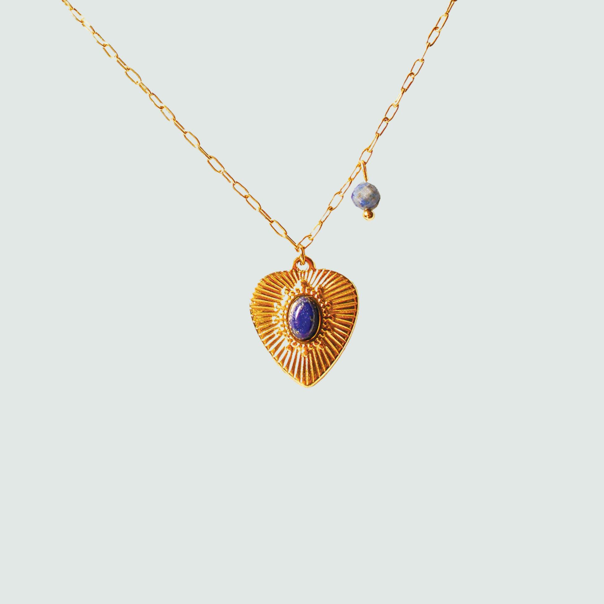 Très raffinée, cette chaîne maille forçat en acier inoxydable doré met en avant un très beau cœur guilloché de style baroque orné d’une pierre précieuse en son centre. L. 40 cm plus extension 5 cm. cœur 1,7 x 1,5 cm - Doré or fin