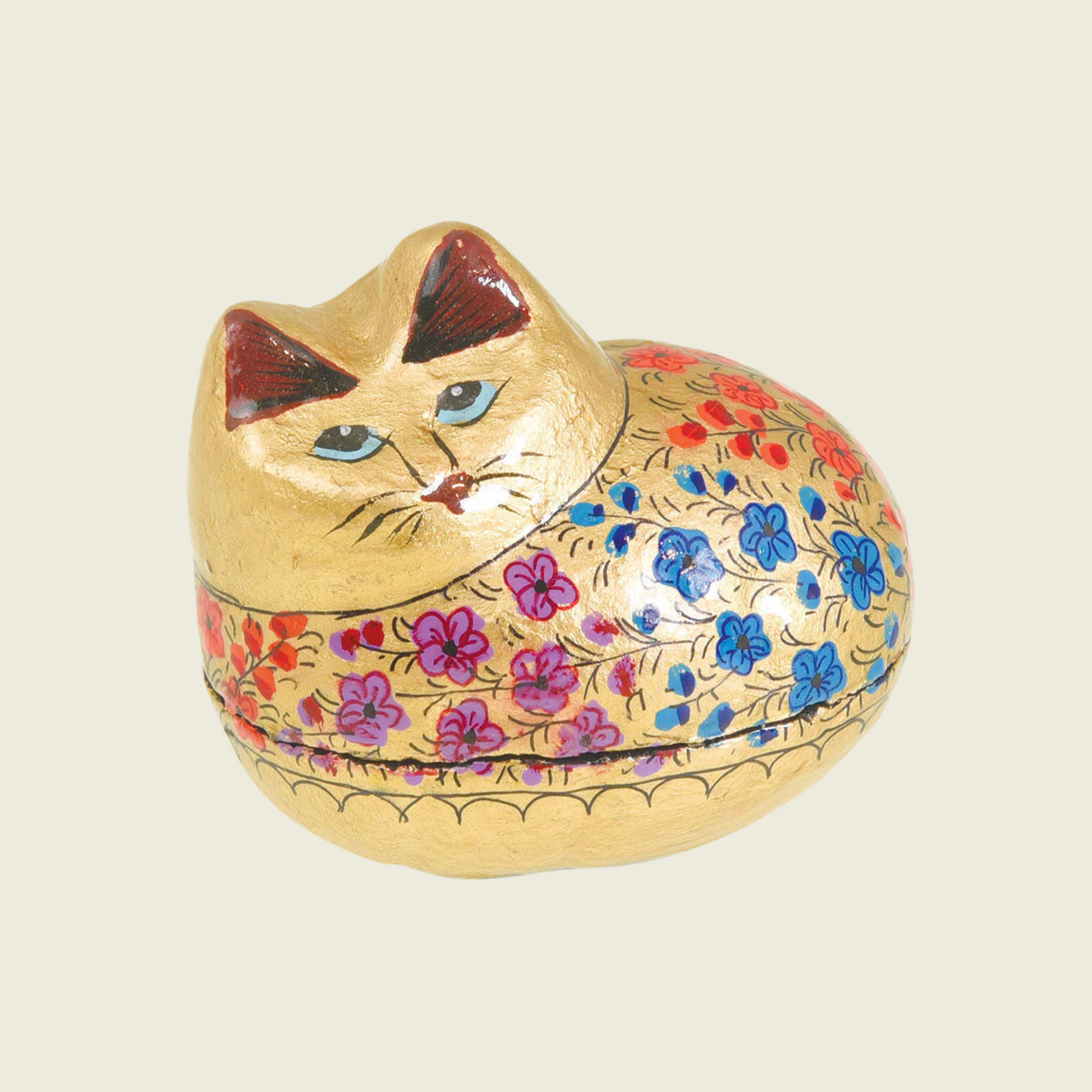 Ravissantes boîtes en « papier-mâché », entièrement fabriquées et peintes à la main. Depuis le 16e siècle cet artisanat du Cachemire venu de Perse perpétue ce savoir-faire qui remonte à l’époque Moghole. Superbe décor fleuri rehaussé à l’or et laqué, chaque pièce est unique ! L. 9, H. 7 cm