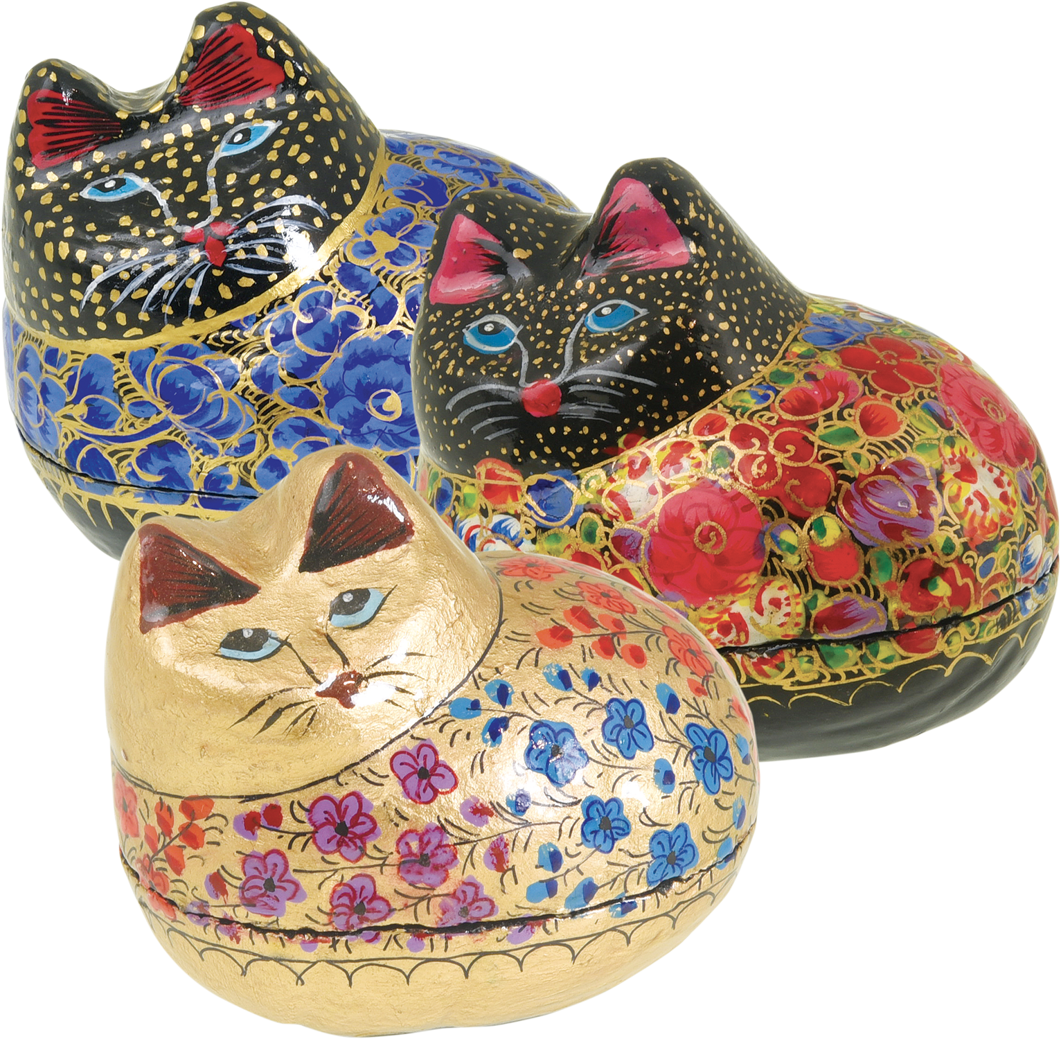 Ravissantes boîtes en « papier-mâché », entièrement fabriquées et peintes à la main. Depuis le 16e siècle cet artisanat du Cachemire venu de Perse perpétue ce savoir-faire qui remonte à l’époque Moghole. Superbe décor fleuri rehaussé à l’or et laqué, chaque pièce est unique ! L. 9, H. 7 cm