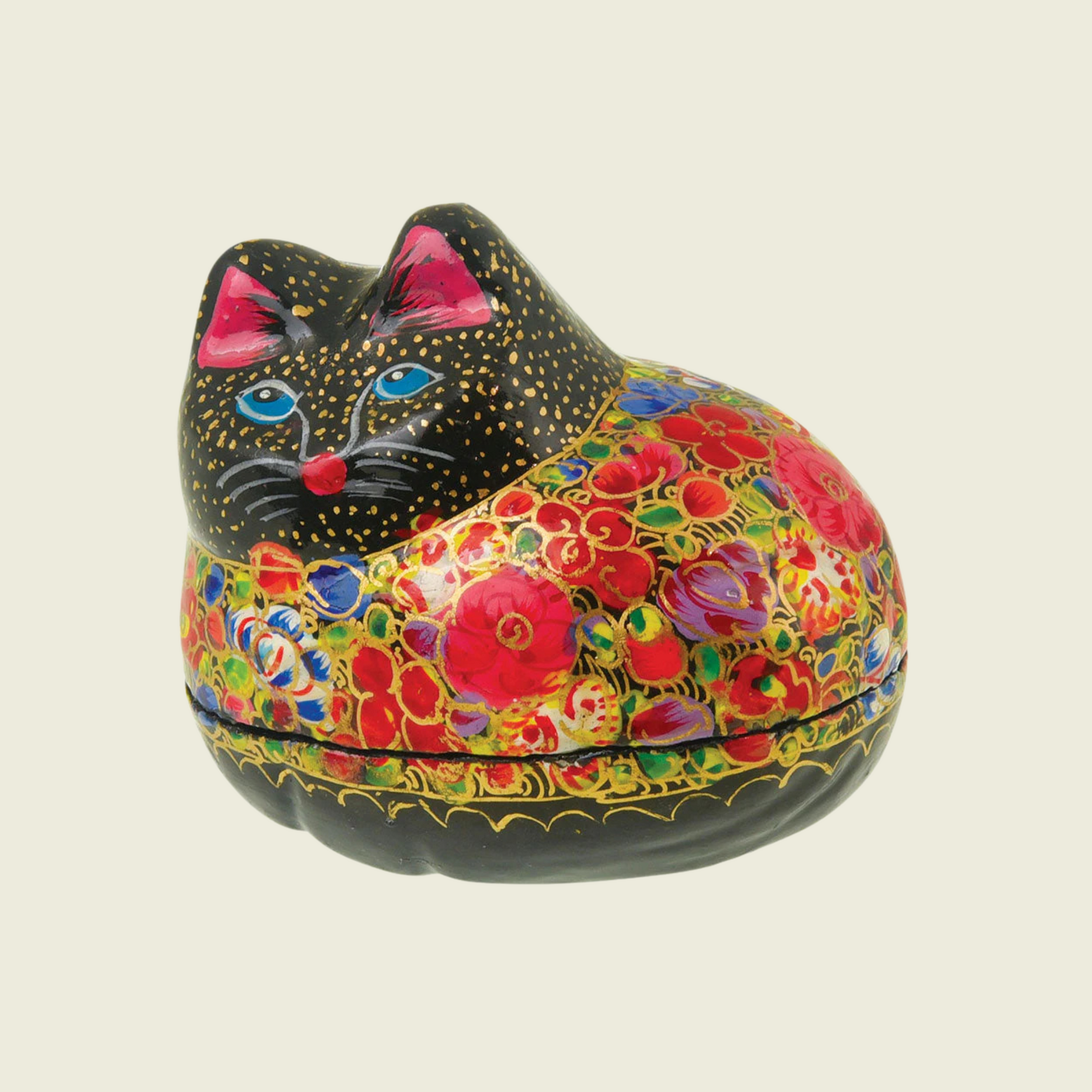 Ravissantes boîtes en « papier-mâché », entièrement fabriquées et peintes à la main. Depuis le 16e siècle cet artisanat du Cachemire venu de Perse perpétue ce savoir-faire qui remonte à l’époque Moghole. Superbe décor fleuri rehaussé à l’or et laqué, chaque pièce est unique ! L. 9, H. 7 cm