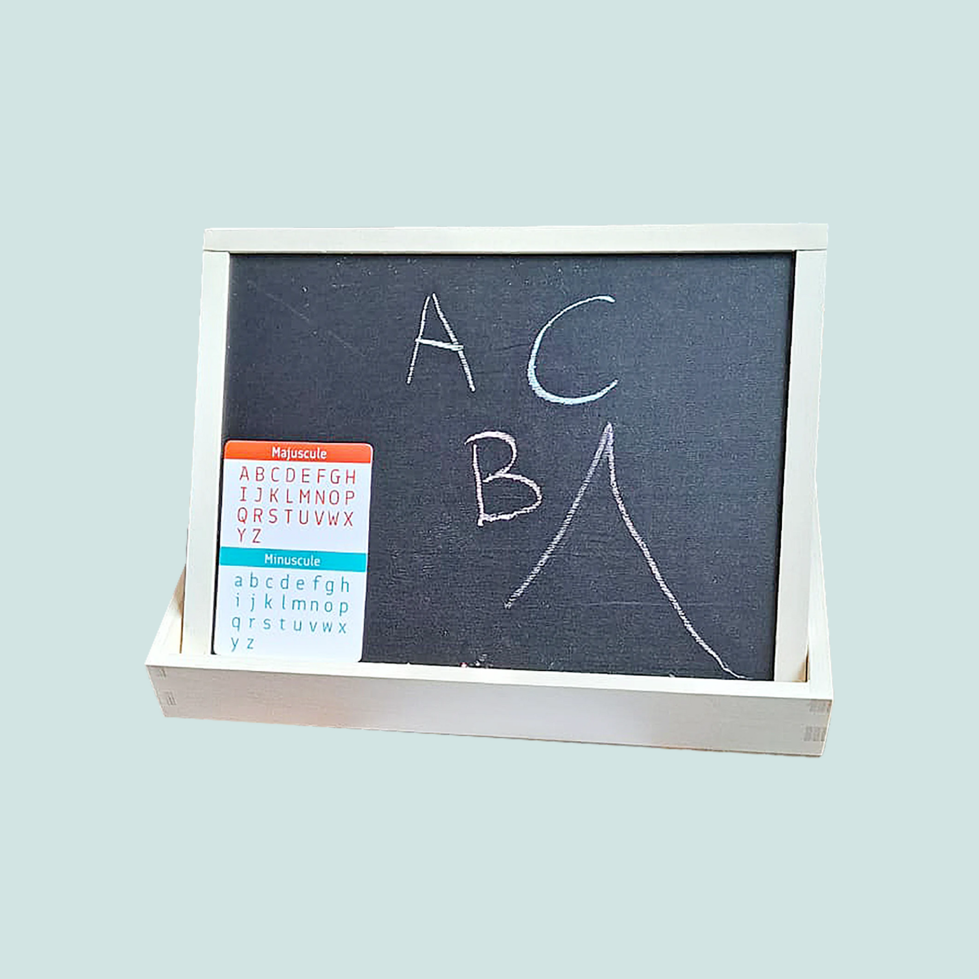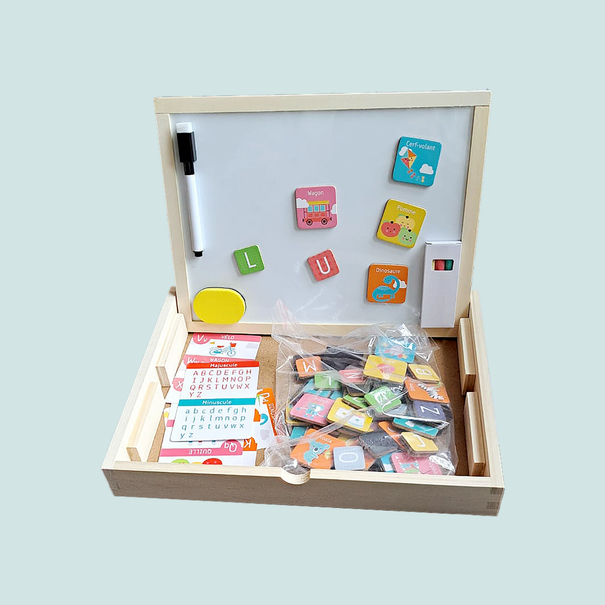 Boîte magique multi fonctionnelle avec 66 magnets, lettres et images, 3 craies, 1 stylo effaçable, 1 éponge, 5 cartes recto-verso. Cette boîte est fermée par un écran recto verso à 3 positions. Une face est un tableau noir ardoise, l’autre est un tableau blanc magnétique. 30 x 24 x 4 cm… Ne convient pas aux enfants de moins de 3 ans
