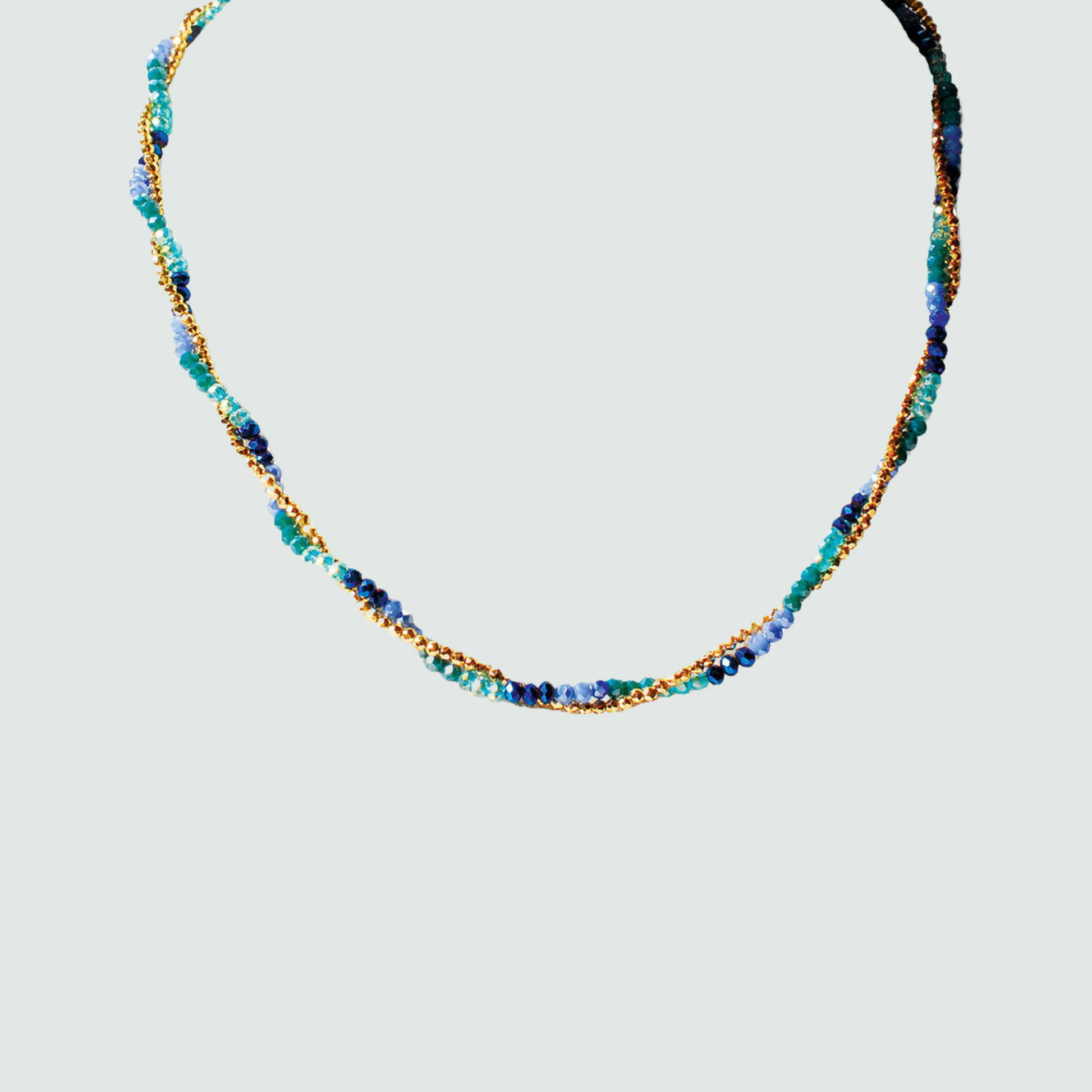 Ce collier raffiné vous séduira par sa torsade discrète et élégante qui entrelace des cristaux colorés aux mille facettes avec une liane de petits cristaux dorés pour un effet scintillant. Un bijou unique et original qui ne passera pas inaperçu et mettra en valeur votre tenue. L. 45 cm.