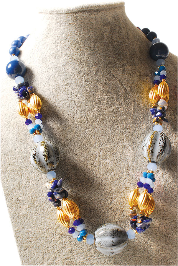 Ce collier est une œuvre d’art qui reflète le talent de sa créatrice. Composé de véritables pierres en lapis lazuli, symboles de sagesse, de petits cristaux facettés, qui brillent comme des étoiles et de perles polies en pierre bleutée. Le tout est espacé par des perlines or et de ravissantes olivettes en métal doré torsadé qui apportent raffinement et préciosité.