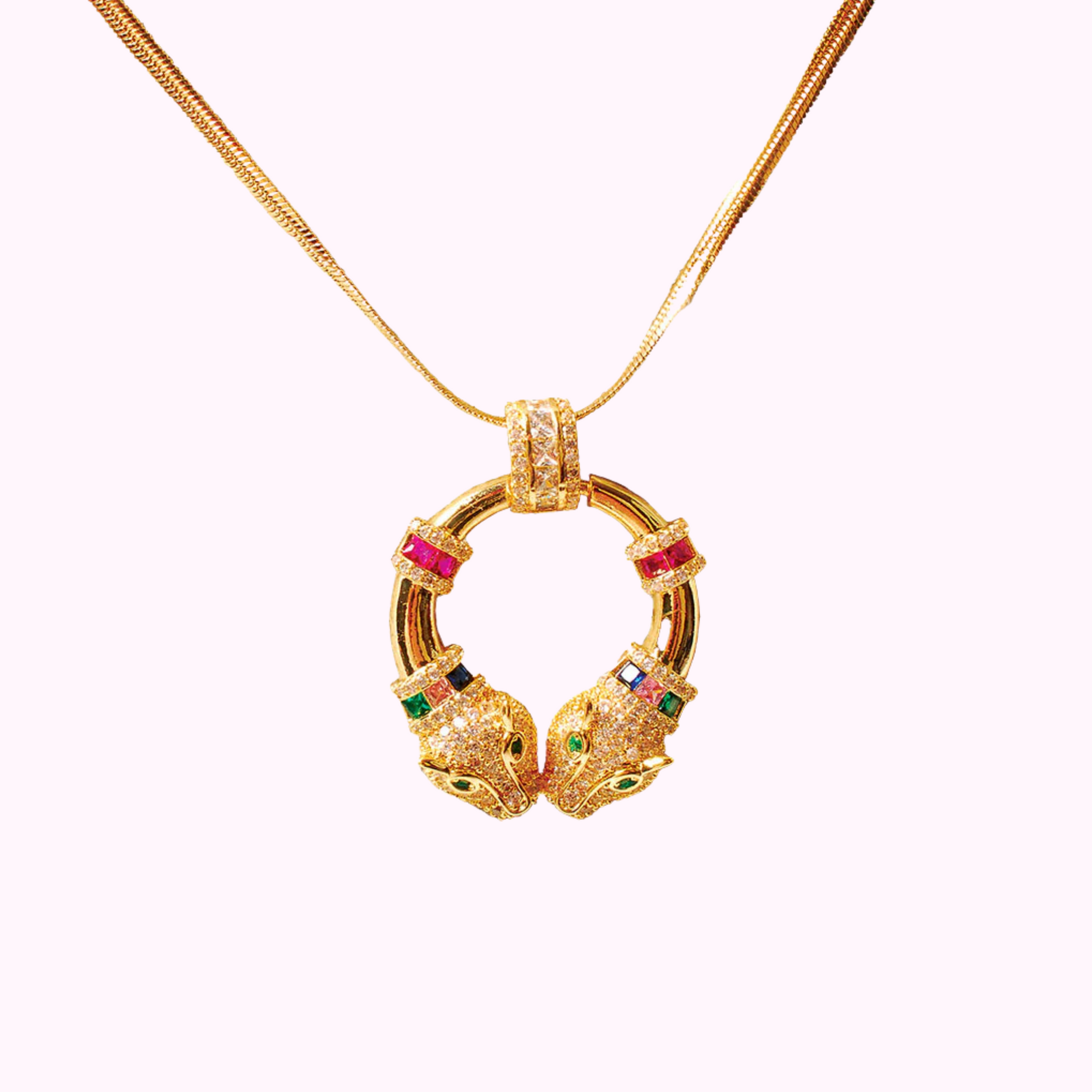 Ces 2 têtes de panthère entièrement pavées de strass sont magnifiques ! Leur collier orné de cristaux rubis, émeraude et saphir montre qu’elles sont domestiquées et sont là pour veiller sur vous. La panthère en bijouterie est synonyme de Luxe et ce bijou s’y prête parfaitement. Pendentif H.3.2 cm. Chaîne plate 45cm + 5 cm. Bijou en acier doré or fin.