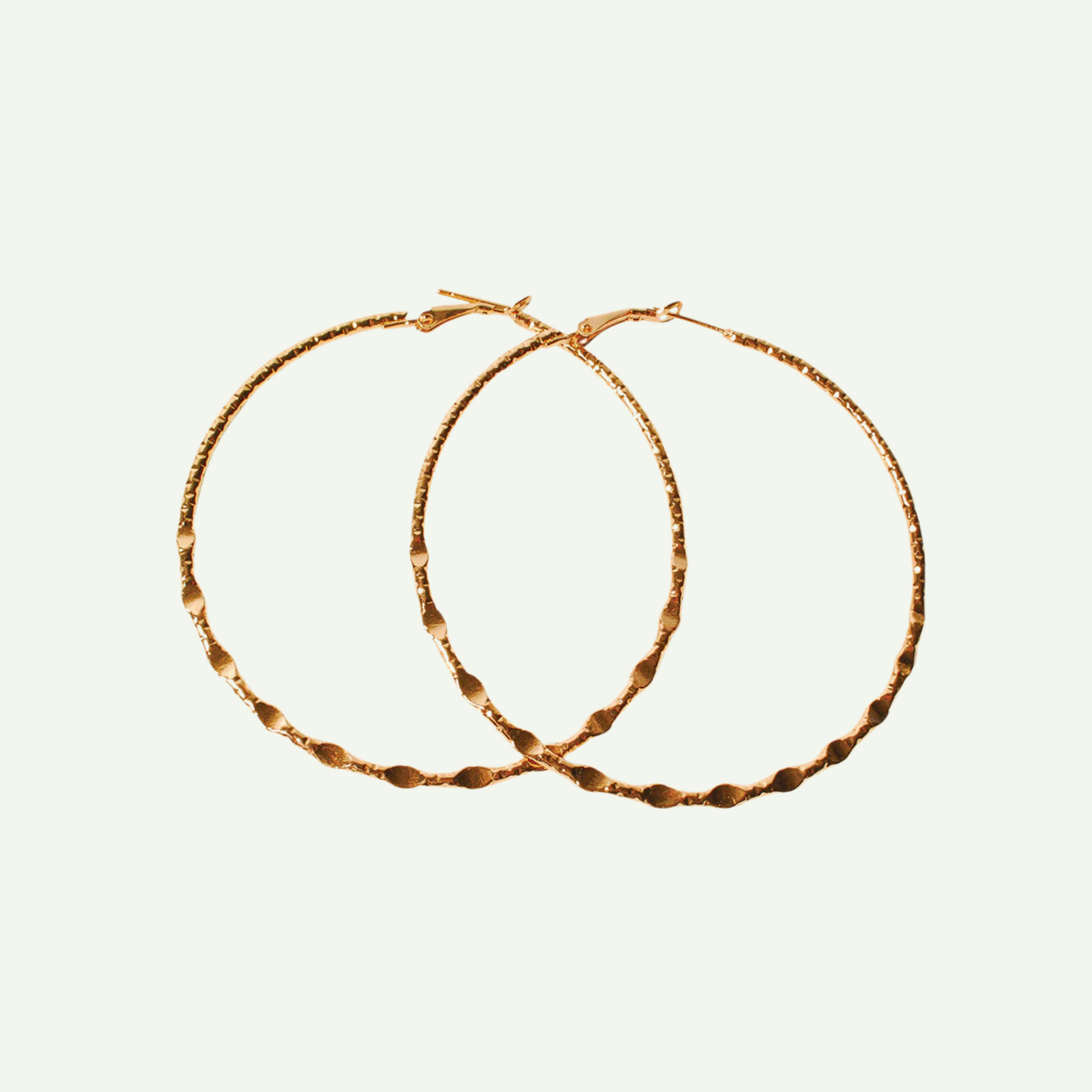 Finement travaillées ces grandes créoles sont très belles. Acier inoxydable doré or fin. D. 7 cm.