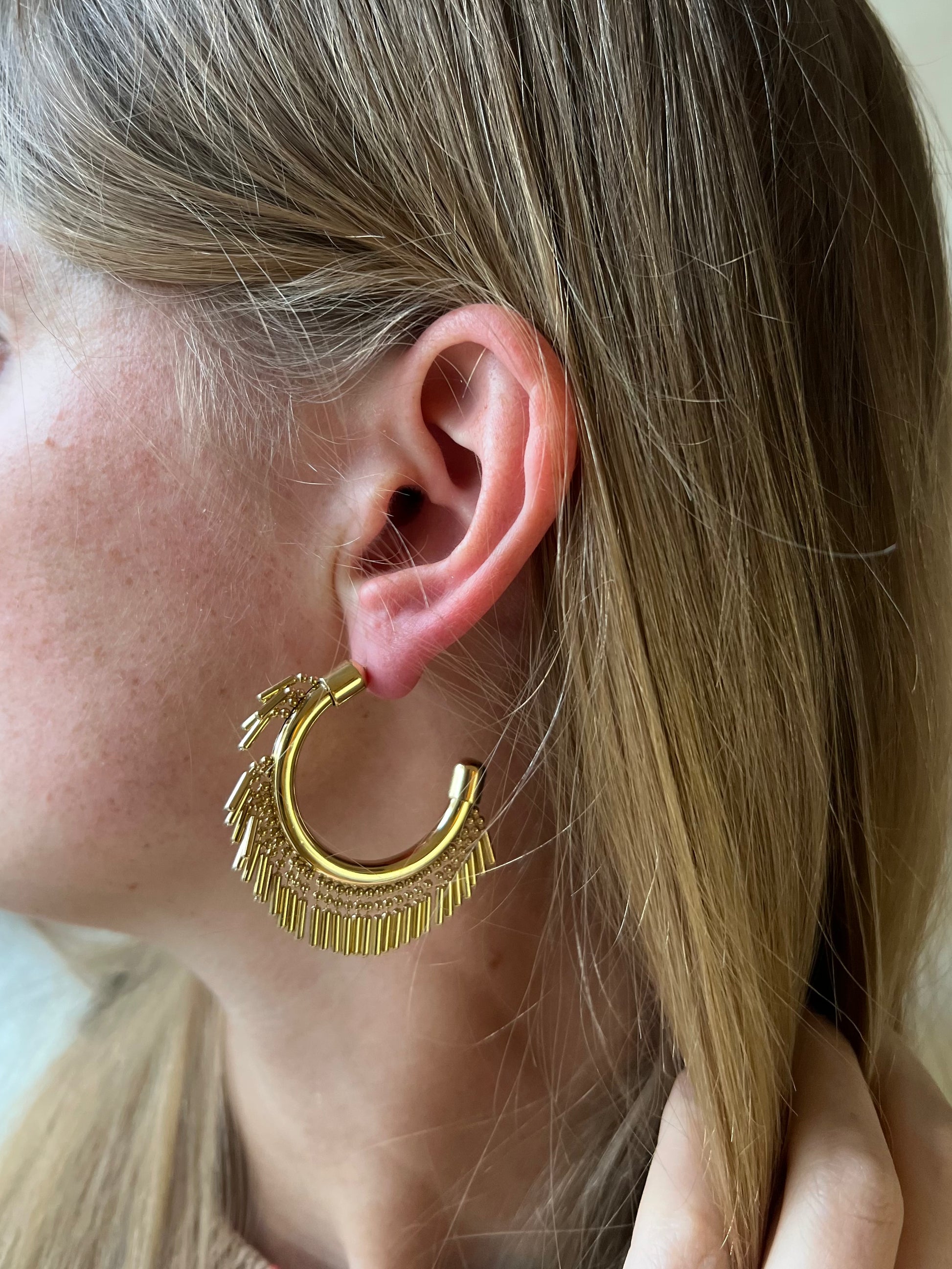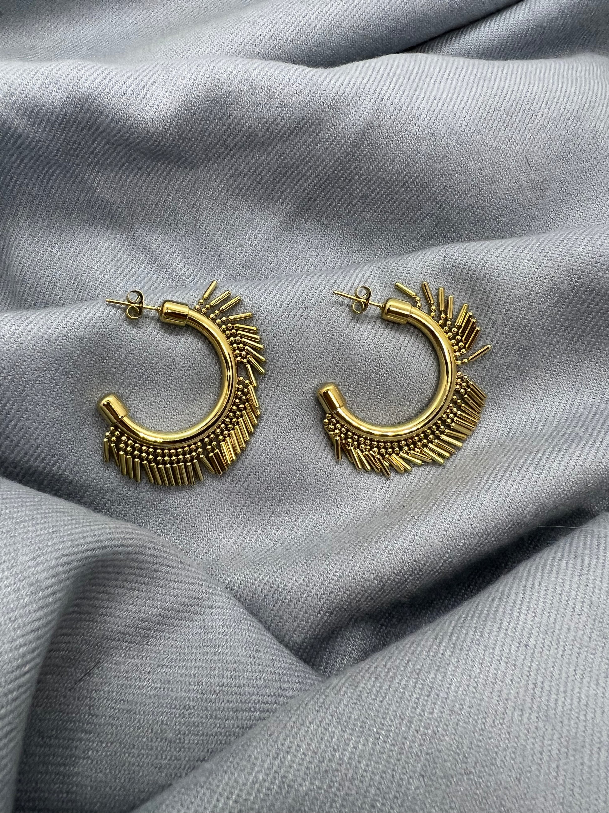 Elles brillent de mille feux, ornées de leur coiffure ondulante. Une création très originale qui se remarque. Acier inoxydable doré or fin. 5 x 3,5 cm