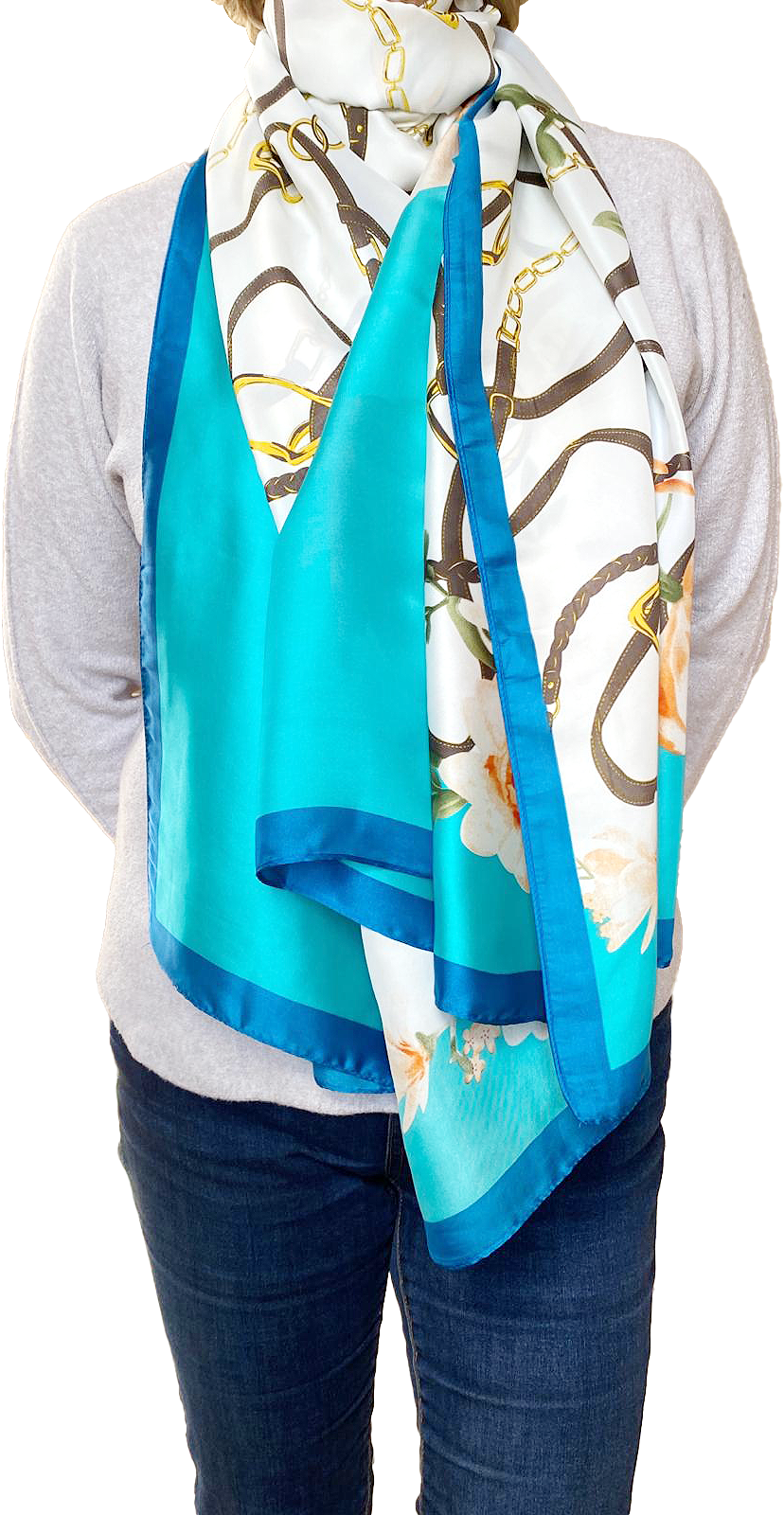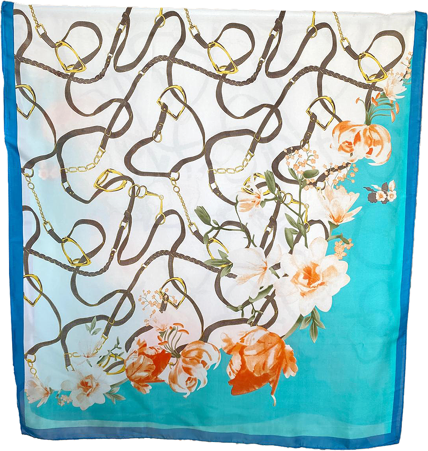 Le bleu turquoise de cette grande étole ornée de magnifiques harnachements de chevaux entrelacés de Capucines est du plus bel effet. Il apporte fraîcheur et sérénité tandis que les Capucines ajoutent une note de vitalité. Cette étoffe soyeuse offre un confort inégalé et avec ses dimensions 180 x 85 cm, elle se prête à de multiples styles : enroulée autour du cou, drapée sur les épaules ou nouée à la taille. Offrez-vous cette pièce unique à un prix accessible et faites sensation où que vous alliez ! Polyester feeling soie.