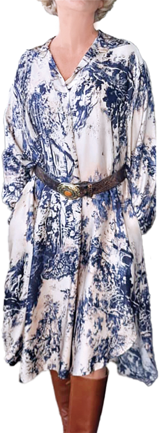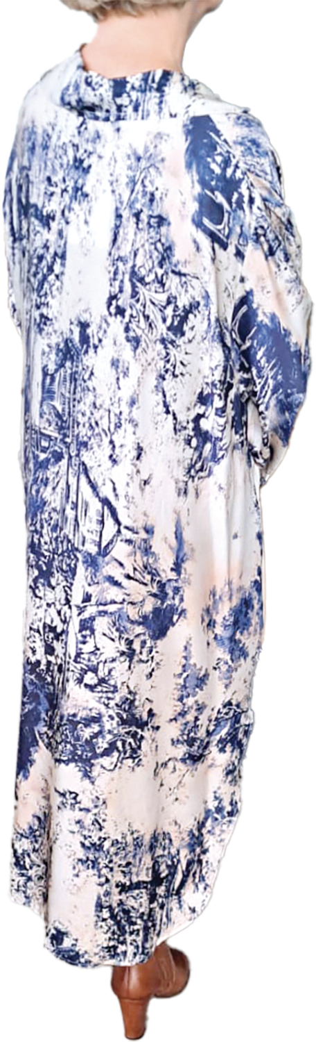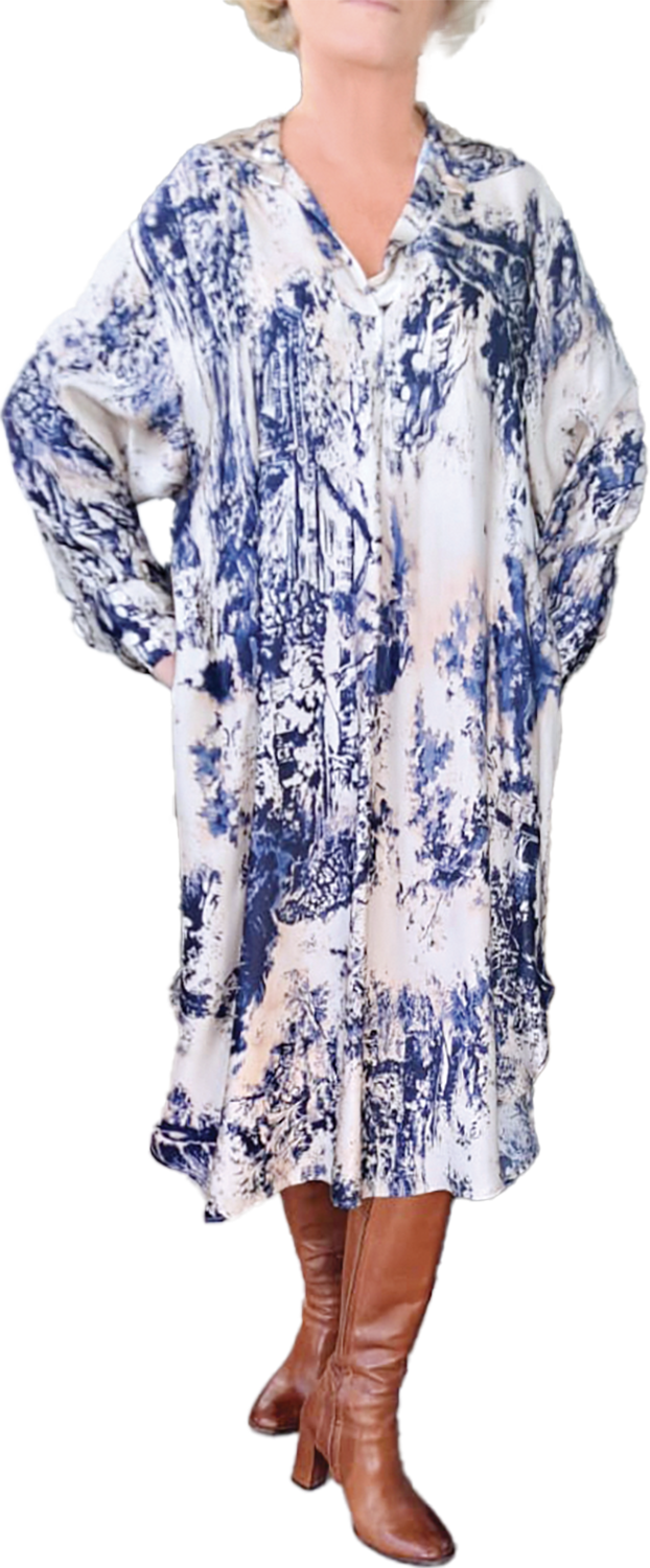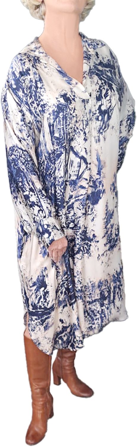 Découvrez l'élégance et la douceur avec notre robe chic en soie et viscose ! Cette pièce unique, conçue pour s'adapter à toutes les silhouettes grâce à sa taille unique, vous enveloppera dans un cocon de confort. Composée de 30% soie et 70% viscose, elle offre une douceur exceptionnelle tout en garantissant une tenue fluide et légère. Le motif bleu qui orne cette robe s'inspire des célèbres toiles de Jouy, apportant une touche de raffinement classique et intemporel à votre tenue. Chaque détail du motif recouvre l’ensemble de la robe, créant un effet visuel saisissant qui ne manquera pas de captiver tous les regards. Que ce soit pour une occasion spéciale ou pour une sortie élégante, cette robe allie parfaitement confort et sophistication. Un véritable incontournable pour celles qui souhaitent allier style et confort. Deux poches discrètes dans la couture.