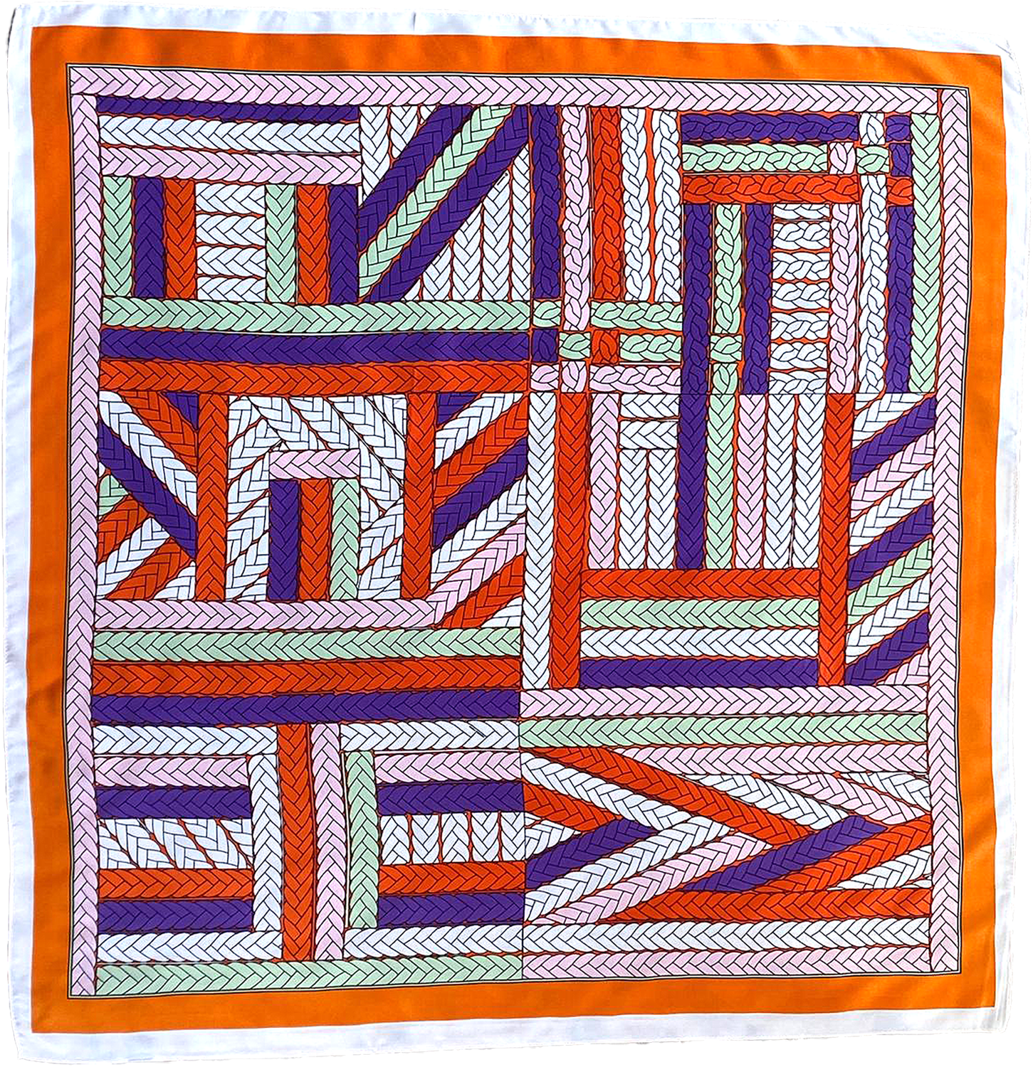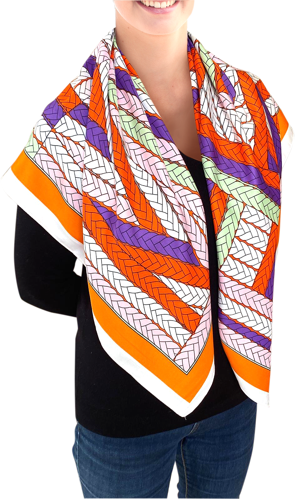 Ce carré de style grande maison avec ses lanières tressées juxtaposées est surprenant et superbe. Les couleurs variées, du blanc au vieux rose, en passant par le violet, l’orange et le vert pistache, lui donnent beaucoup d’allure et rappellent les vitraux des cathédrales, faisant de ce carré un accessoire à la fois élégant et intemporel. Polyester feeling soie. 90 x 90 cm.