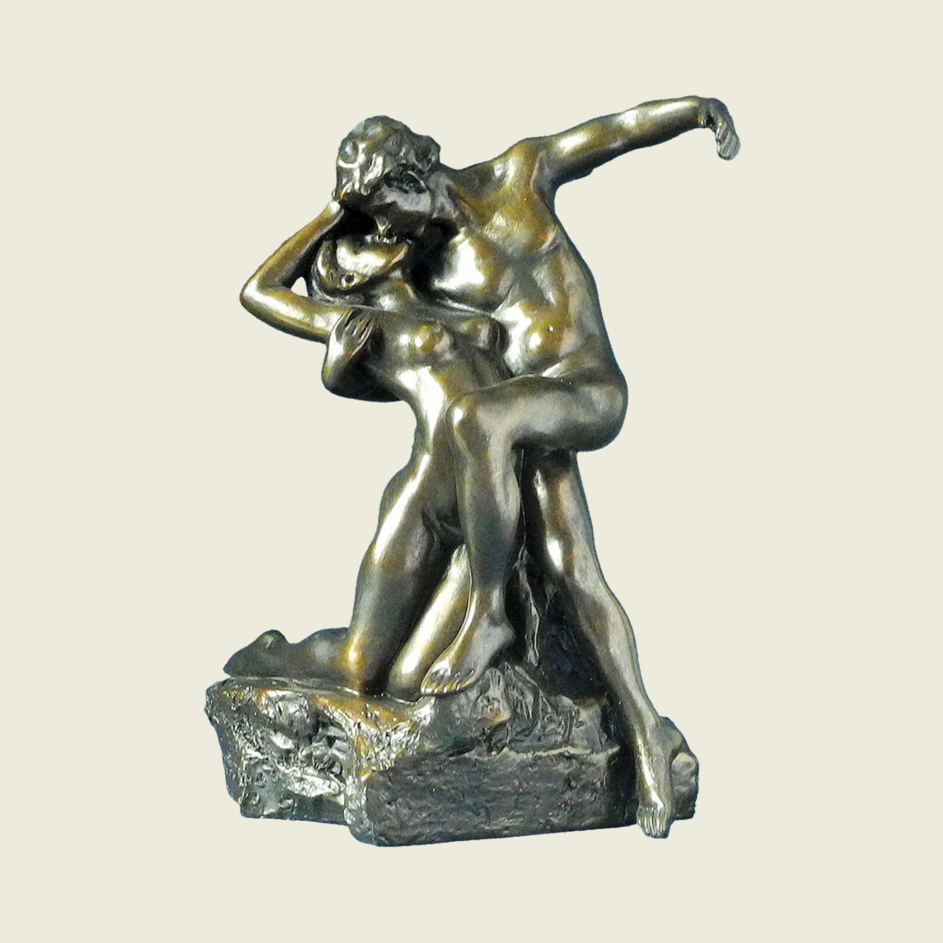 Cette image de deux amoureux est tout à fait de style baroque et fut très rapidement l’une des œuvres les plus populaire de Rodin. Le couple, tout comme celui du célèbre Baiser, exprime tout le bonheur ressenti par Rodin au cours des premières années de sa liaison avec Camille Claudel. C’est à cette époque qu’il découvrit, selon ses propres dires, tout ce que la combinaison d’attraction physique et d’harmonie spirituelle pouvait signifier pour un homme. Résine patine bronze - H. 20 cm