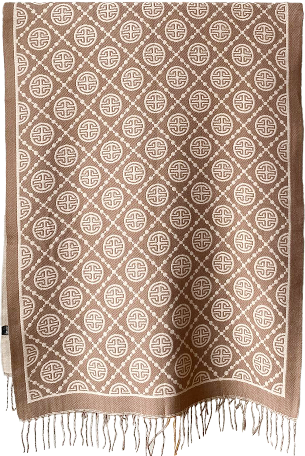 Le logo de la Chine ancienne figurant sur cette étole très douce et au tissage serré est le logo stylisé du mot AMOUR. Chaude et très agréable à porter elle est réversible beige ou bleue d’un côté avec le logo blanc ou noir et vice versa de l’autre. 30 % laine et 70 % viscose. 68 x 190 cm + franges.