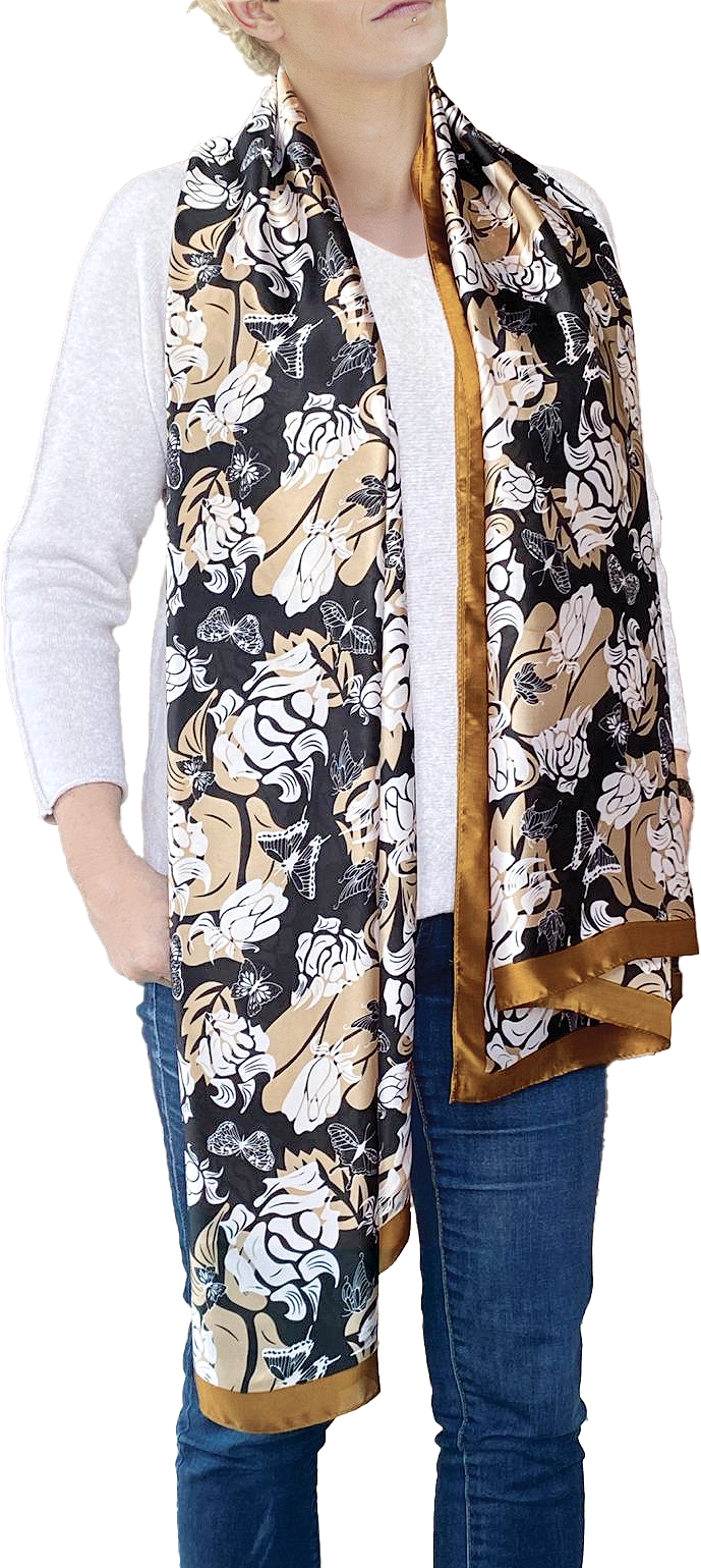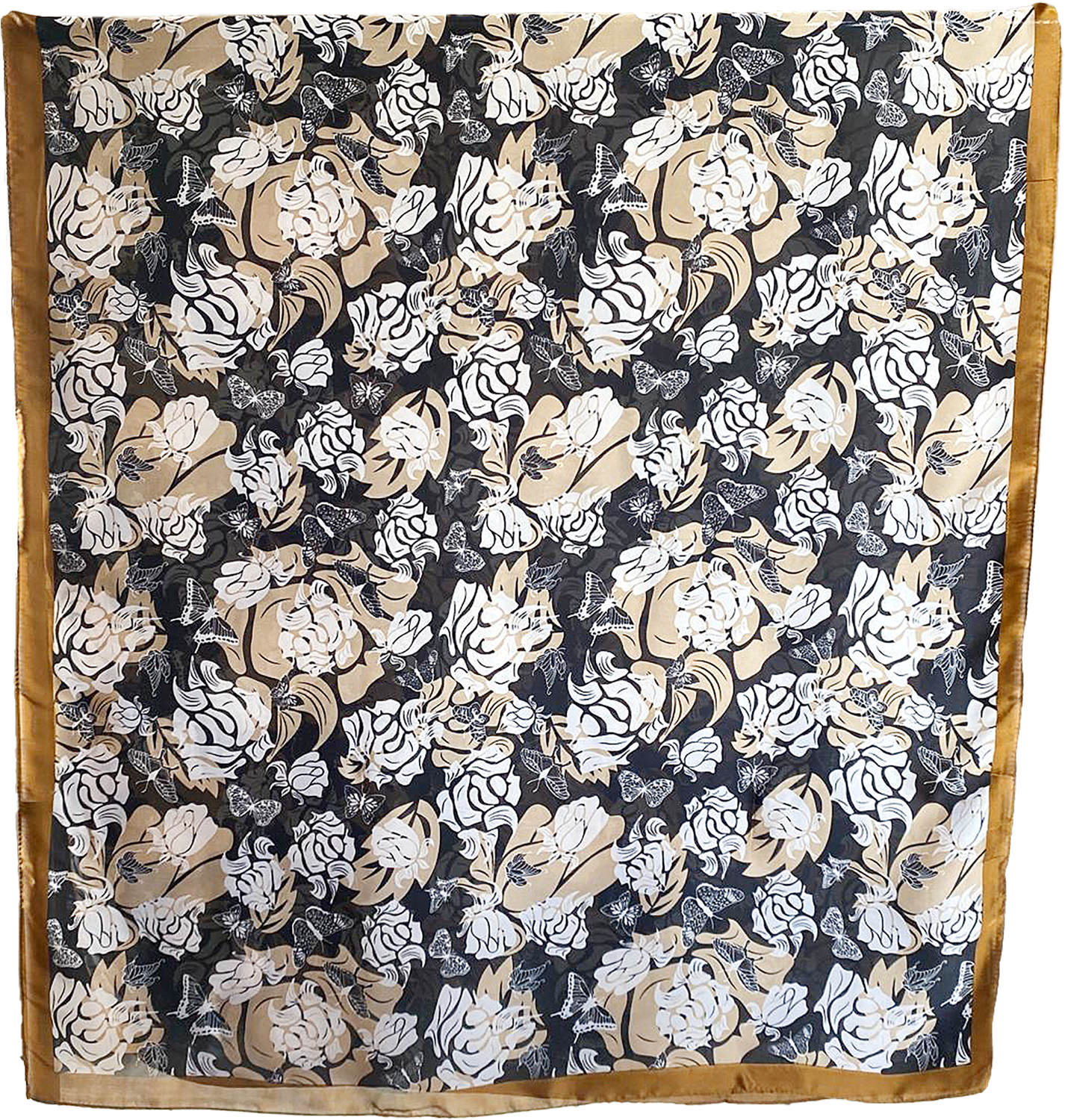 Cette étole soyeuse de 180 x 85 cm est un véritable bijou. Son décor doré de fleurs et de papillons, sur un fond noir, s’inspire d’un paravent en laque noire et or de style Art Déco. Lorsque vous la portez, vous vous enveloppez dans une élégance intemporelle, évoquant les soirées glamour des années 1920. Les motifs floraux et les délicats papillons dansent avec grâce, ajoutant une touche de mystère et de sophistication à votre tenue. Cette étole est bien plus qu’un simple accessoire de mode ; elle raconte une histoire, évoque des émotions et transporte celle qui la porte dans un univers de beauté et d’élégance. Polyester feeling soie.