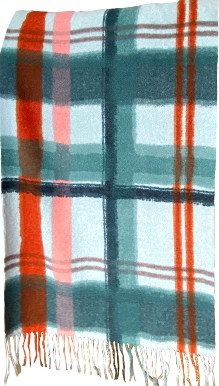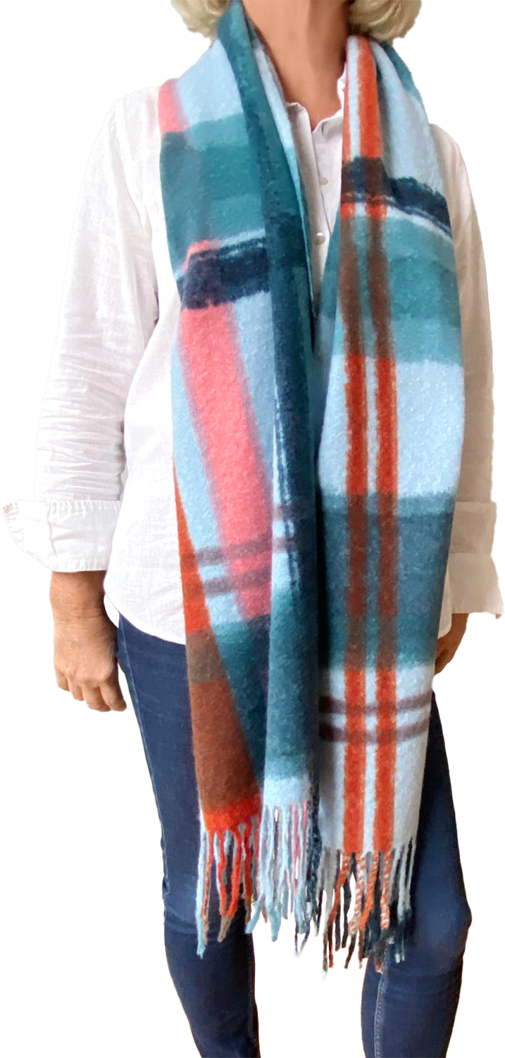 Son harmonie de bleus ou de beige rehaussée de filets colorés est vraiment Superbe ! Belles et douces, ces deux grandes étoles vous protègeront des intempéries avec élégance. 30 % Laine 70 % viscose - 60 x 180 cm plus franges