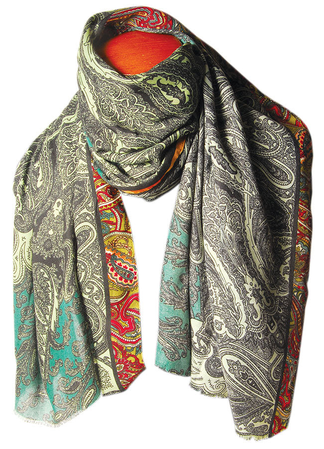 Légère et aérienne cette grande étole motif cachemire est très raffinée. Elle s’inspire des textiles hippie des années 60 qui reviennent à la mode. Ce motif et la couleur verte de cette étole se combinent pour créer un magnifique décor qui fait penser avec ses fleurs et ses feuillages à un jardin oriental. Deux fines bandes en bordure sur la longueur lui apportent une touche de couleur qui vient rehausse l’harmonie verte de cette Magnifique étole. 20 % coton – 80 % viscose - 85 x 180 cm.