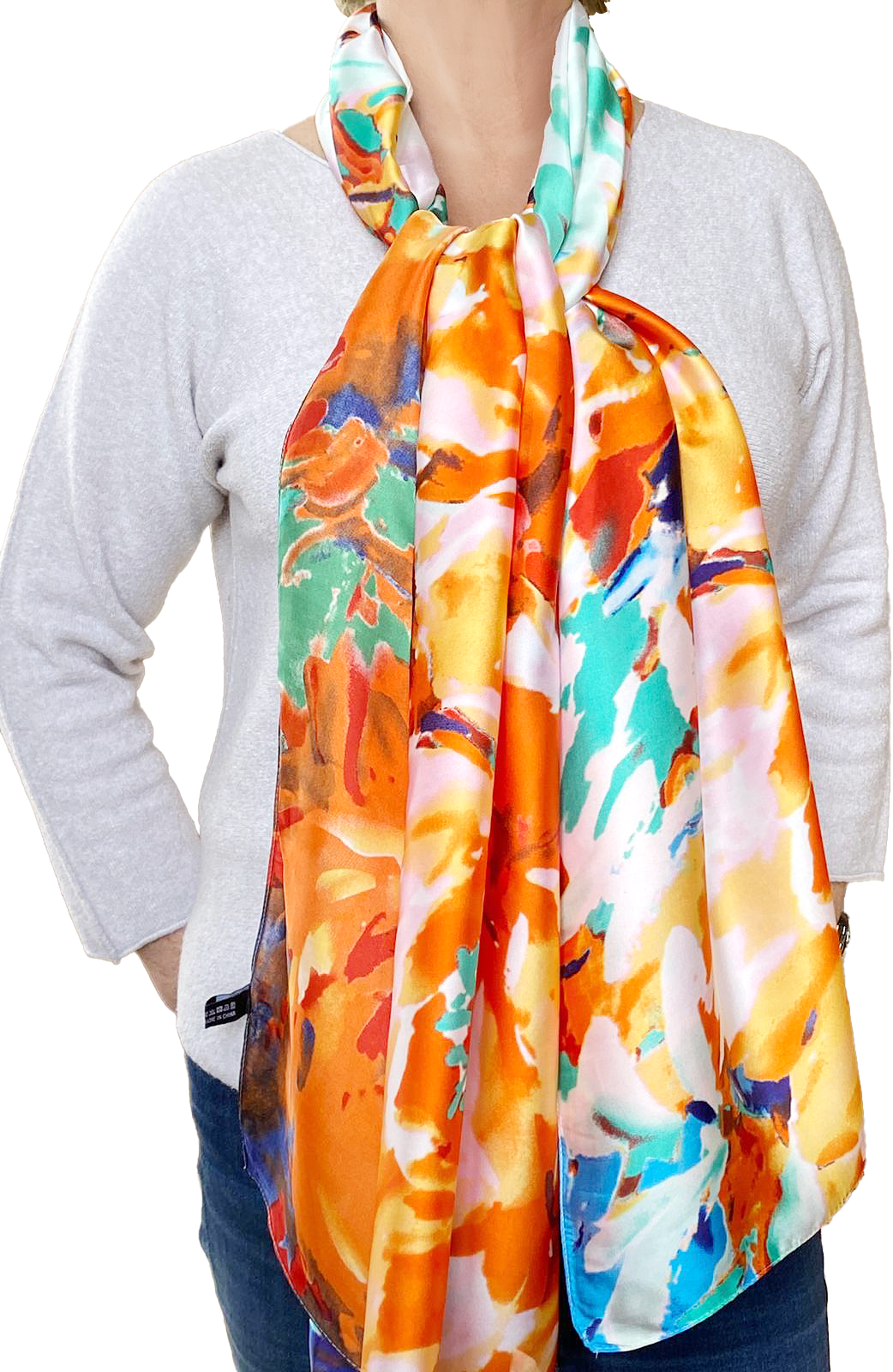 Cette étole en polyester feeling soie est un hommage vibrant aux toiles chatoyantes et fleuries d’Eugène Boudin (Honfleur, 1824 - Deauville, 1898) précurseur de l’impressionnisme, et plus spécialement inspirée de sa toile « Jeté de fleurs ». Cette étole mesurant 180 x 85 cm enveloppera vos épaules de douceur et de couleurs éclatantes. Un accessoire élégant pour toutes les saisons !