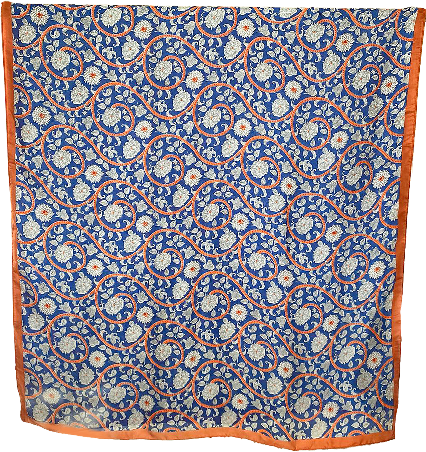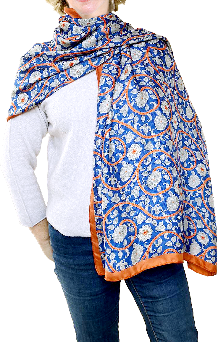 Les tiges ocre-rouge s’entrelacent en spirales dans le bleu lumineux de l’étoffe comme les secrets gardés par les superbes murs décorés du palais de Topkapi. Les fleurs argentées qui tapissent cette étole éclosent en soie délicate, où chaque motif raconte une histoire, habitée de sultans, d’émirs et d’amours éternels. Portez-la fièrement, comme une reine drapée de mystères et de splendeur. Elle est très belle avec une Magnifique prestance ! Etole soyeuse 180 x 85 cm. - Polyester feeling soie.
