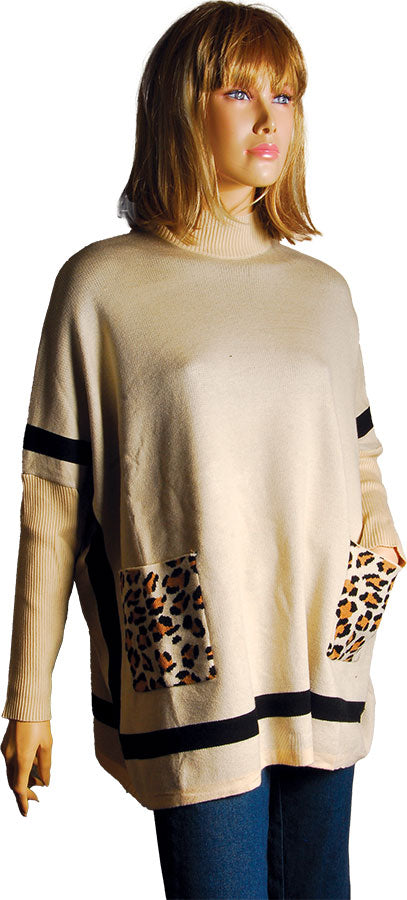 Ce vêtement très confortable et Tendance est une Création Miss Charm – Paris. Son tissage serré lui donne une allure chic et décontractée. Sa grande amplitude, L. dos 70 cm, largeur 78 cm et ses manches tissées bord-côte sur 25 cm lui donnent une grande liberté de mouvement. Deux poches plaquées sur le devant apportent une touche d’originalité avec leur motif léopard. Il est Magnifique ! Il vous accompagnera en toute saison. 10 % Laine, 22 % coton, 35 % viscose, 17,5 % polyamide, 15,5% polyester. Taille Unique.