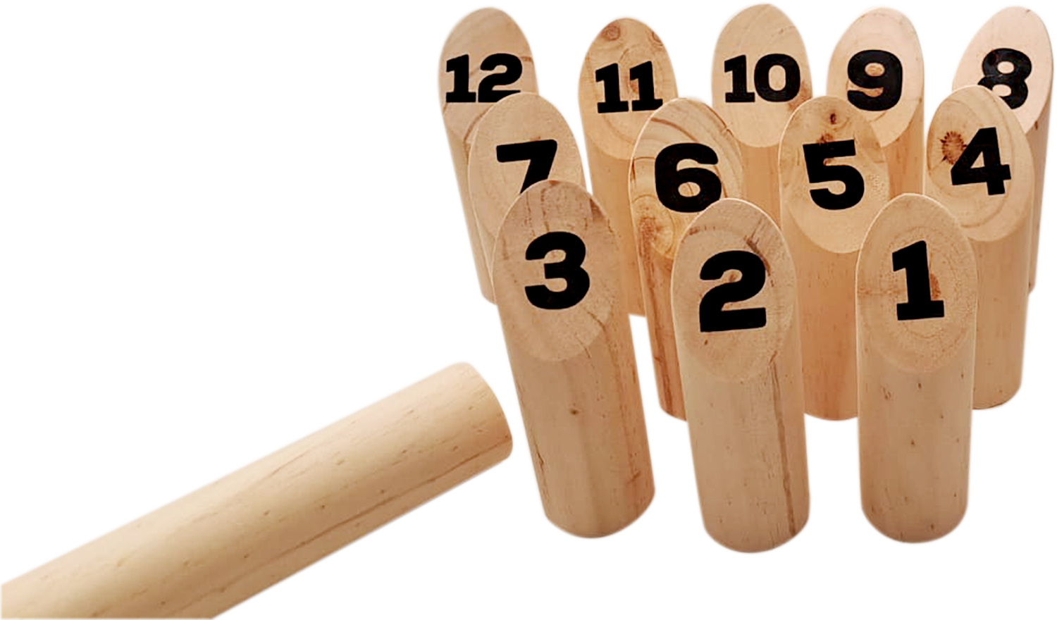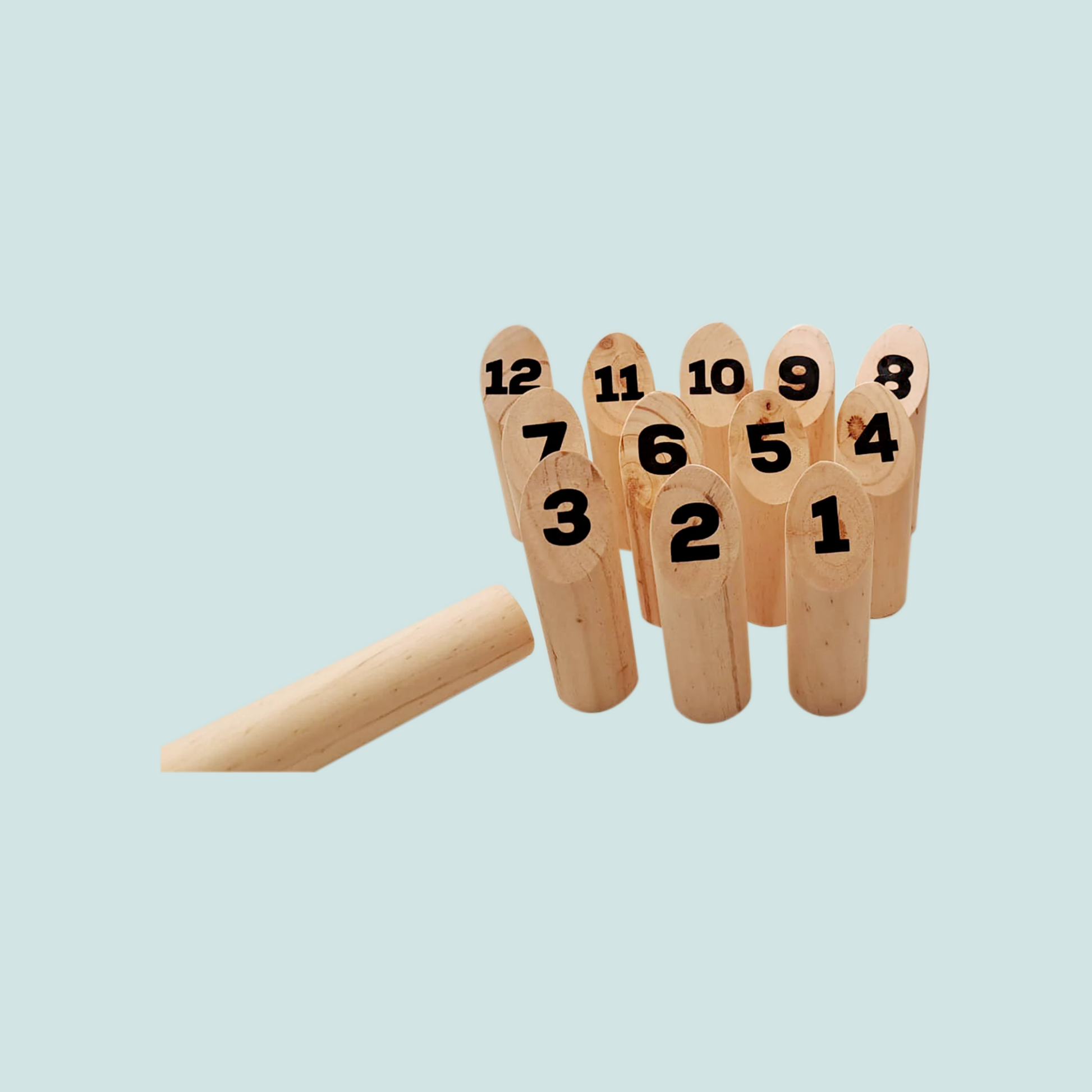 | Un beau jeu, tout en bois, de 12 quilles numérotées. Des quilles qu'il s'agit de faire tomber à l'aide d'un lanceur bois. Règles du jeu inscrites sur la boîte. Hauteur 20 cm |