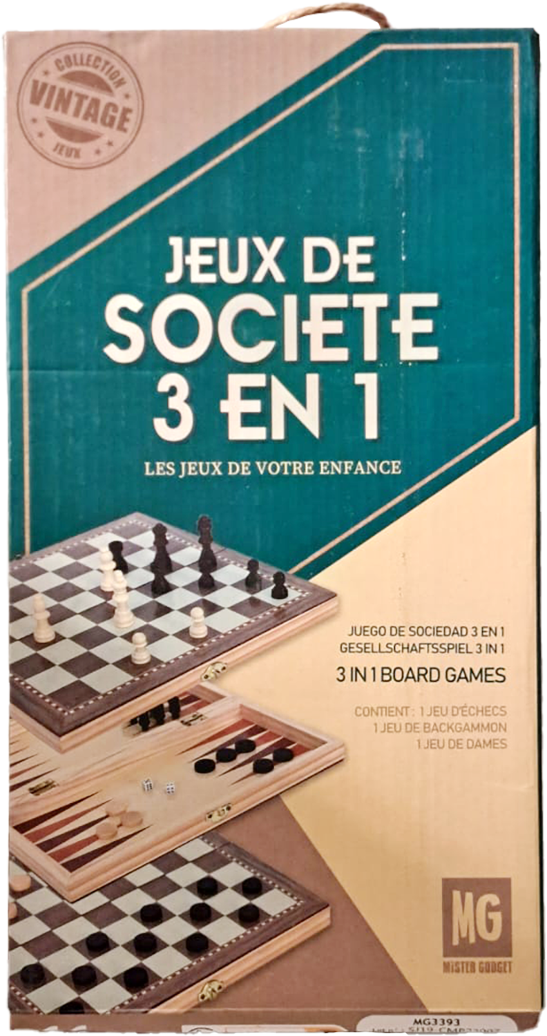 | Une petit malette à emporter partout, pour jouer en vacances ou au cours d'un voyage. Dames, Backgammon, Echecs : plateaux pliables et pions de bois + 2 dés. A partir de 3 ans. Avec règles du jeu. Plié : 13 x 28 cm |