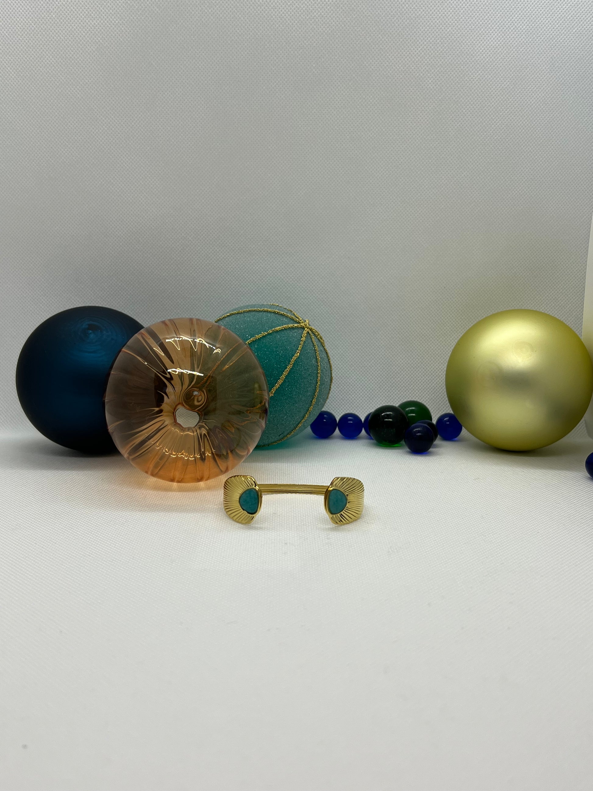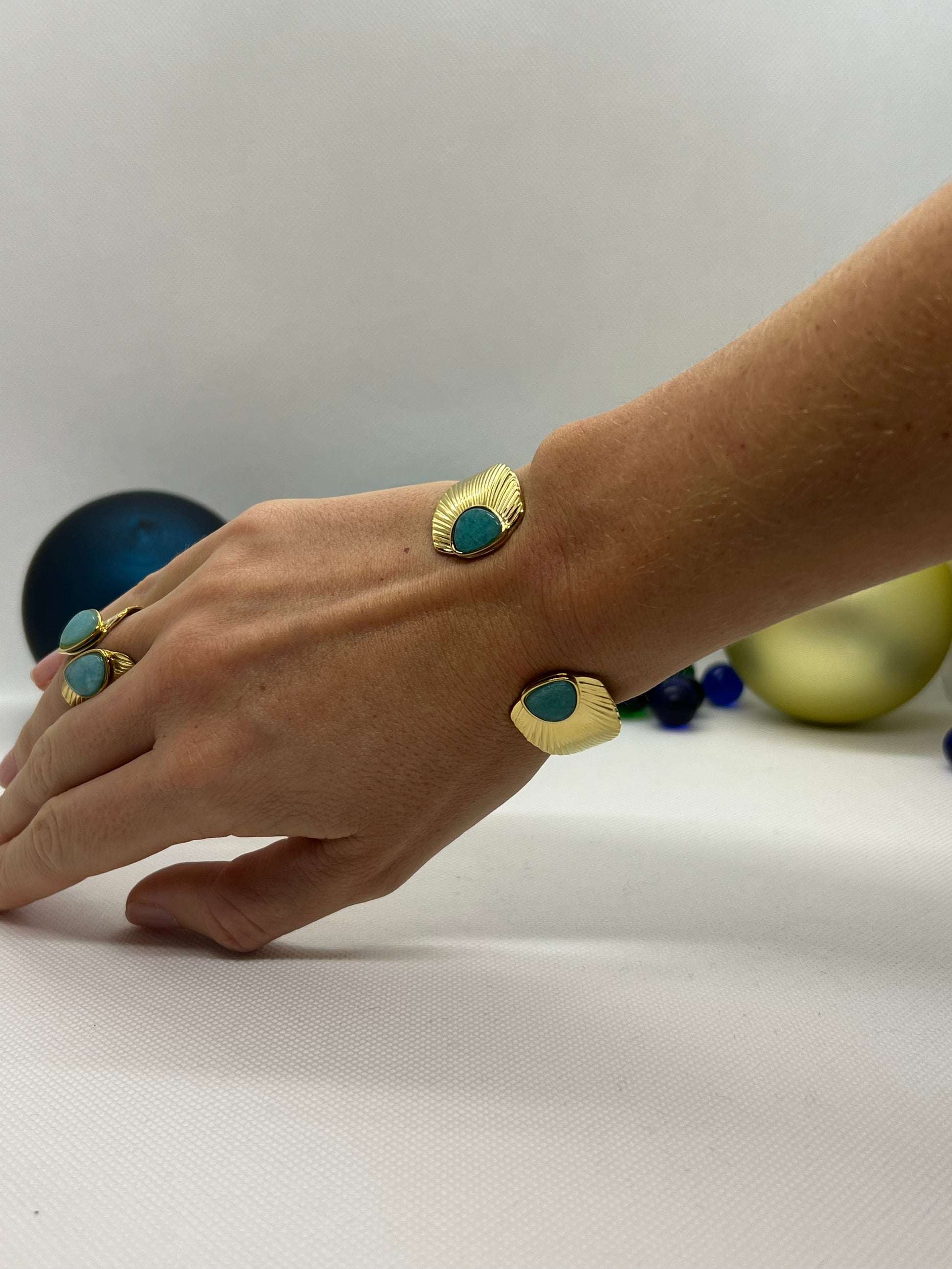 Beau bracelet, bleu profond de l’amazonite, une pierre découverte sur les bords du fleuve le plus puissant de la planète, l’Amazone. Sertie sur jonc délicatement intaillé. Acier inoxydable doré or fin. Taille réglable. 2,5 cm