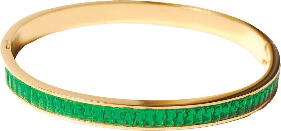 Classique et Superbe ce jonc a beaucoup d'allure avec sa rangée de cristaux émeraudes digne des plus grands joailliers. Acier inoxydable doré à l'or fin fermeture très discrète. Pour l'ouvrir, faire un mouvement de pression en sens inverse au niveau de la fermeture (extérieur partie supérieure / intérieur partie inférieure) pour dégager le picot de fermeture.