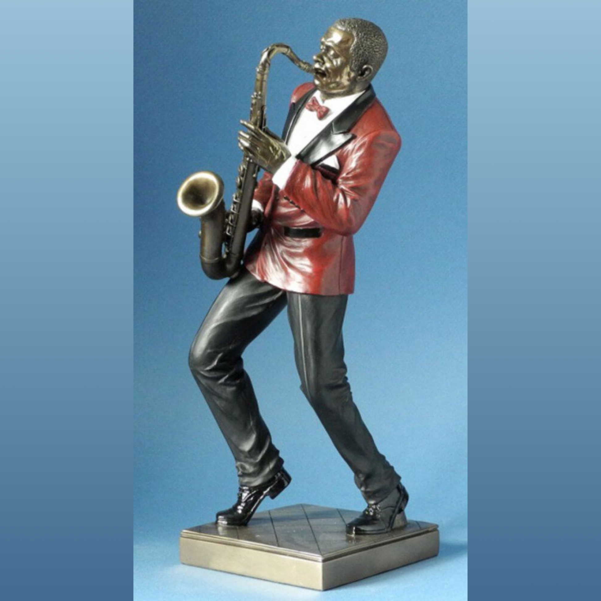 Superbe cliché que ce joueur de saxo en tenue de gala… Nostalgie des années 50. Résine peinte à la main. H. 29 cm