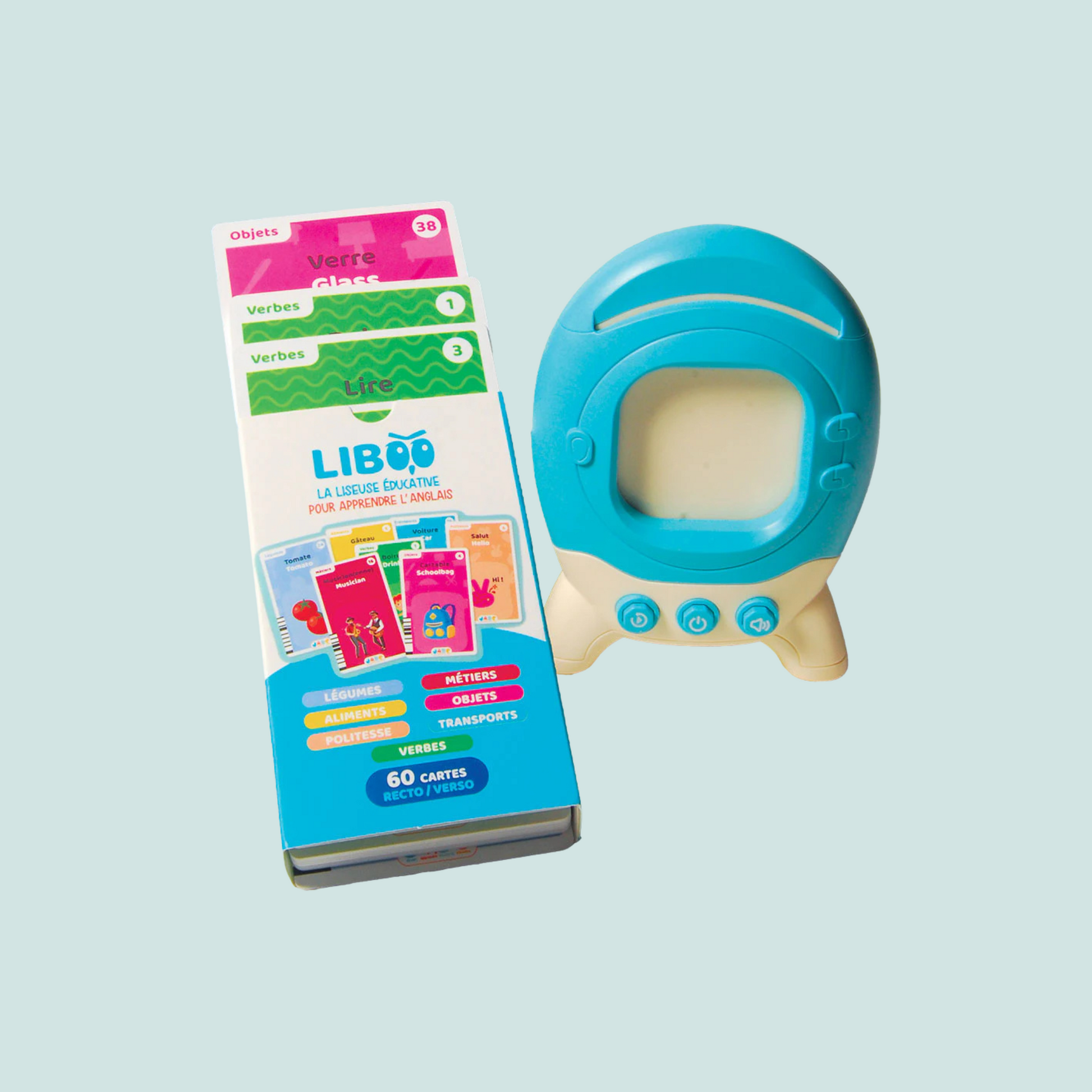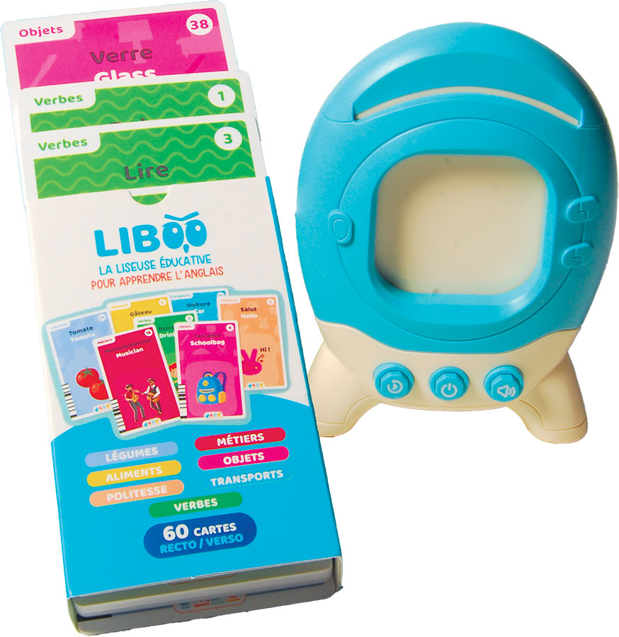 Voici le set parfait pour apprendre l’anglais aux plus petits. 240 mots, donc 240 cartes à insérer dans la liseuse pour entendre et lire le mot, qui est dit d’abord en français, puis en anglais. Pour enrichir son vocabulaire et familiariser l’enfant avec les sonorités. Livrée dans sa boîte. 3 piles fournies. A partir de 3 ans. Design français. La liseuse 13 x 10 cm